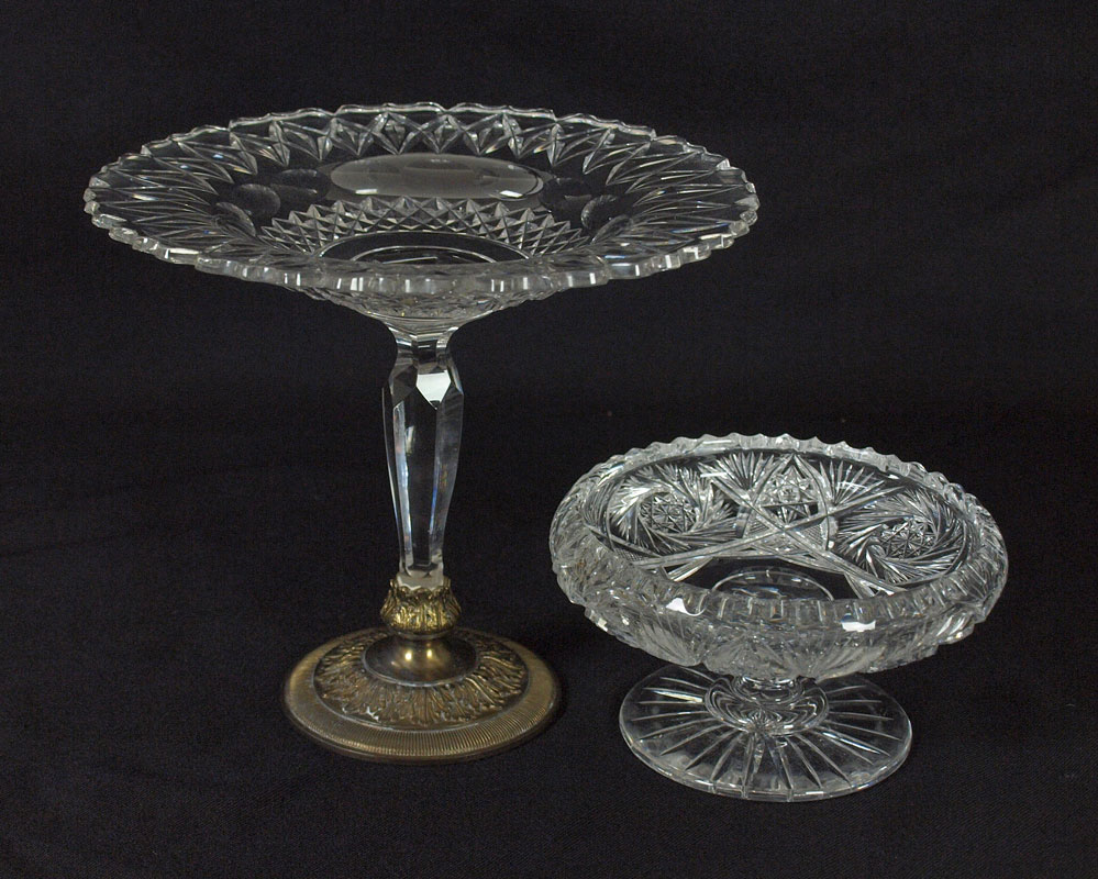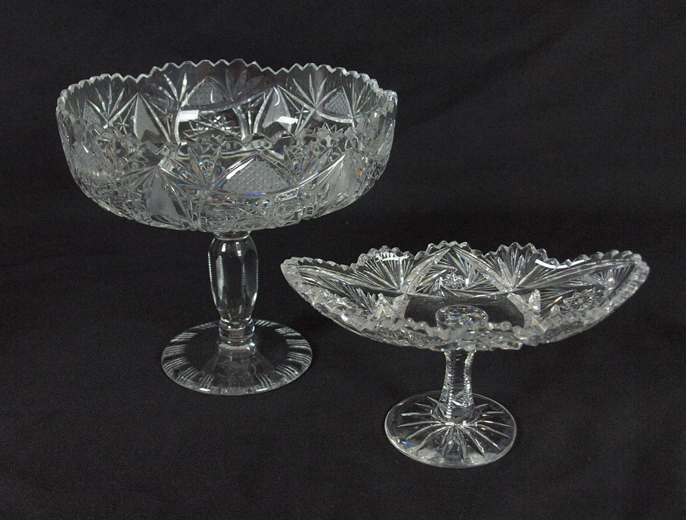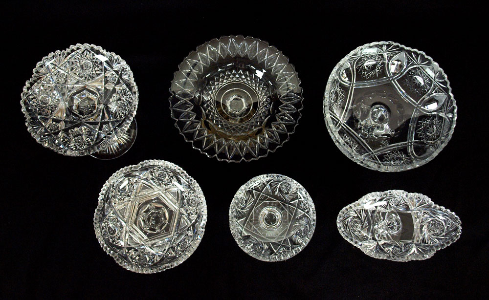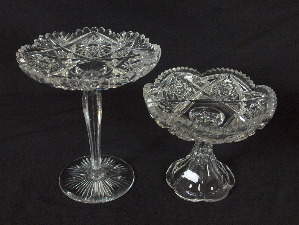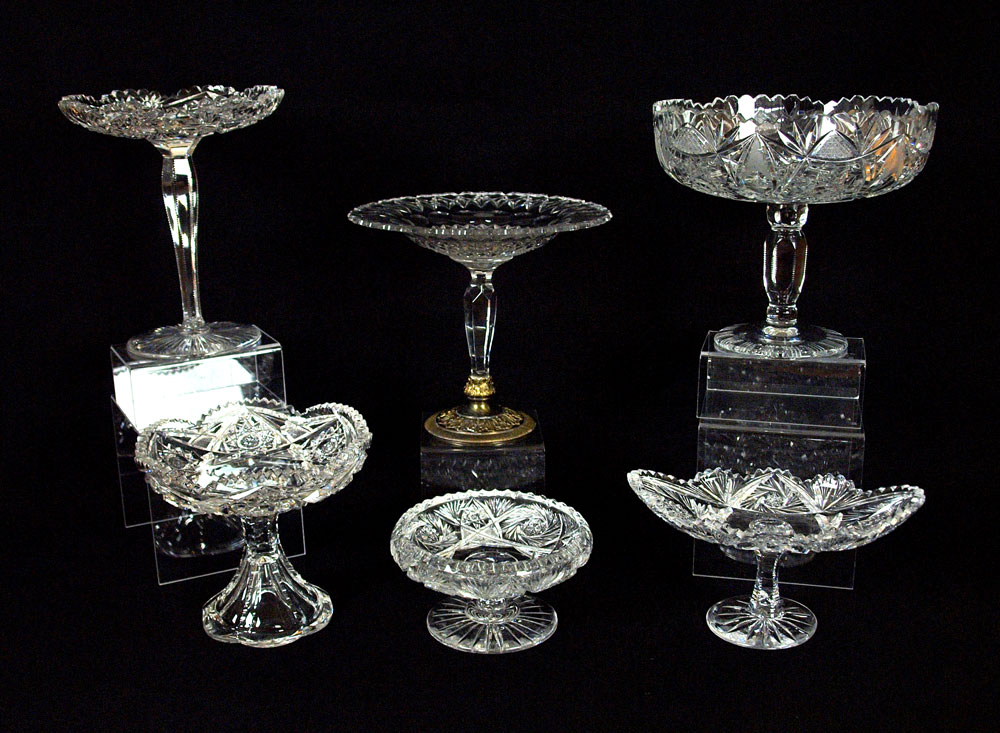 6 AMERICAN BRILLIANT CUT GLASS COMPOTES: Including silverplate base Pairpoint C1427. Variety of patterns and sizes 3-8'' tall and 6'' - 8 1/2'' dia.