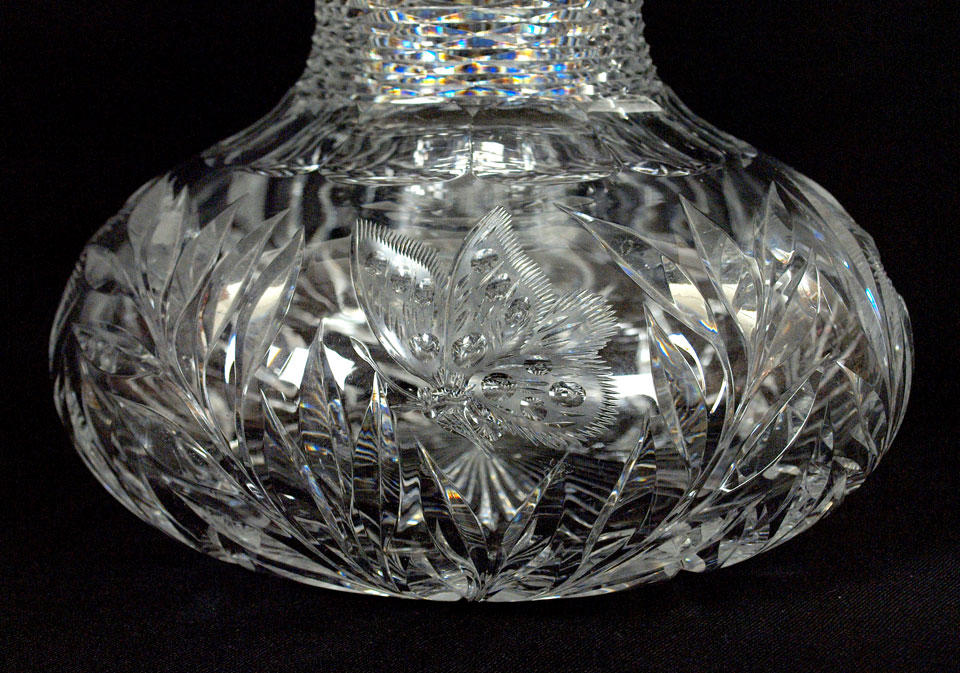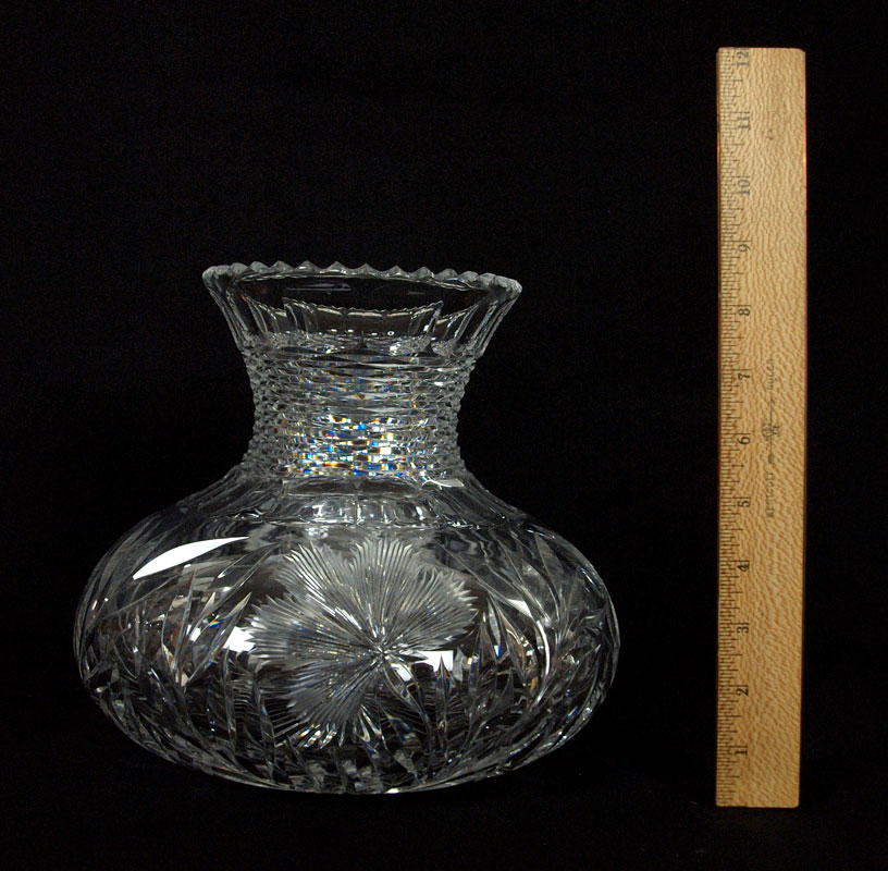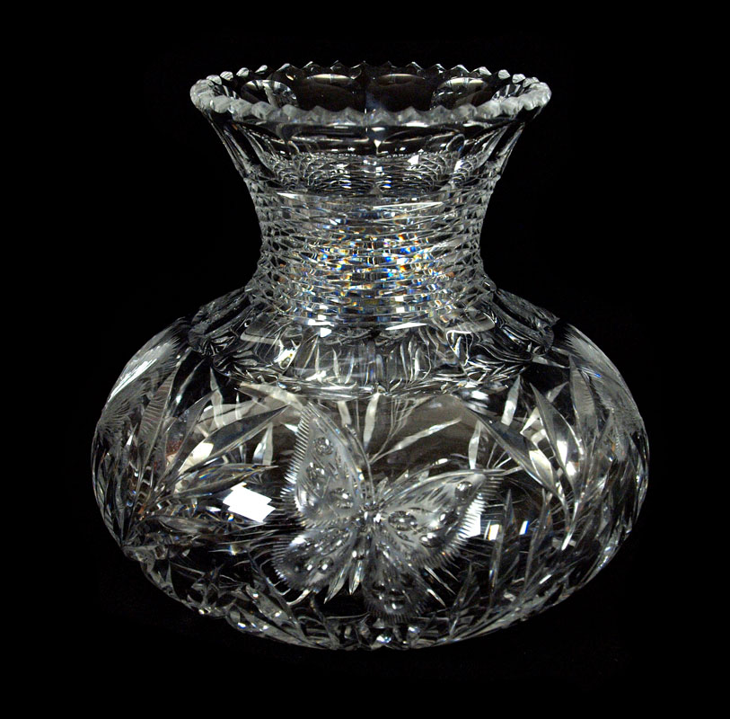 AMERICAN BRILLIANT PERIOD CUT GLASS VASE: Squat body cut in butterfly and flower design, with a slender notched neck. Approx. 8''h. x 8 1/2'' at the widest point.