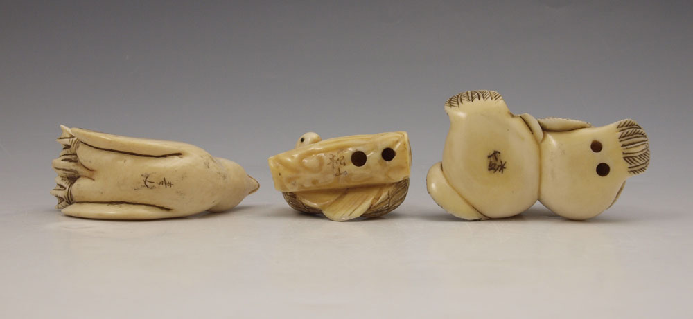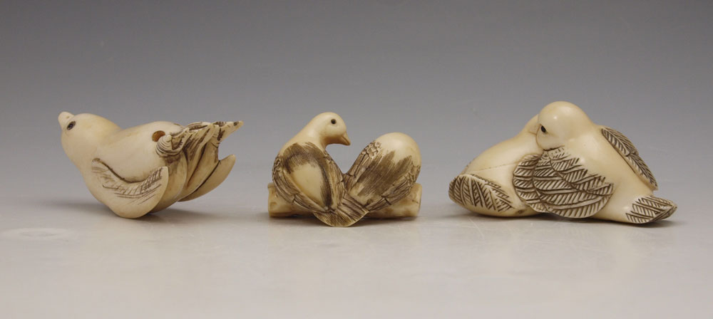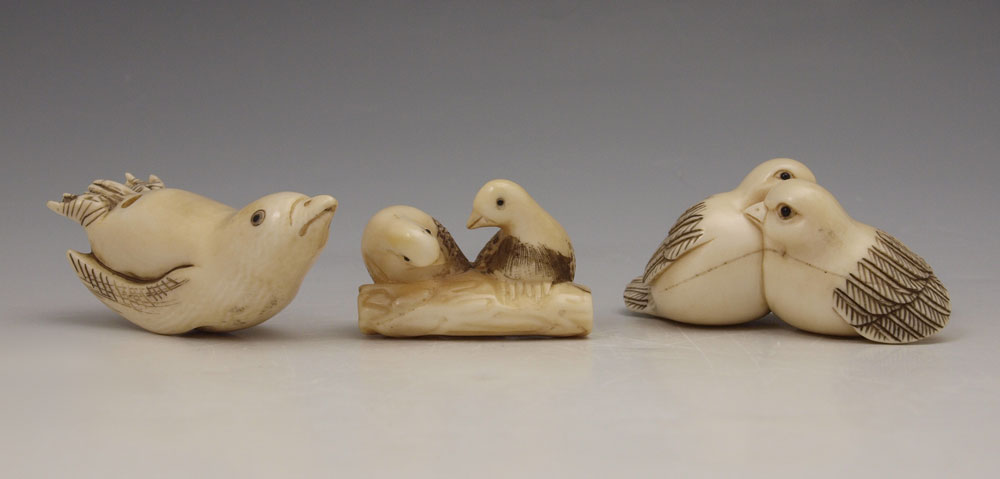 3 PIECE CARVED IVORY BIRDS NETSUKE: To include 1) Single bird rocking on stomach, signed, 2 1/4'' long. 2) Pair of birds perched on branch, signed, 1 1/2'' long. 3) Pair of birds embracing, signed, 1'' h.