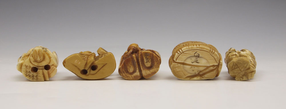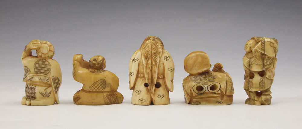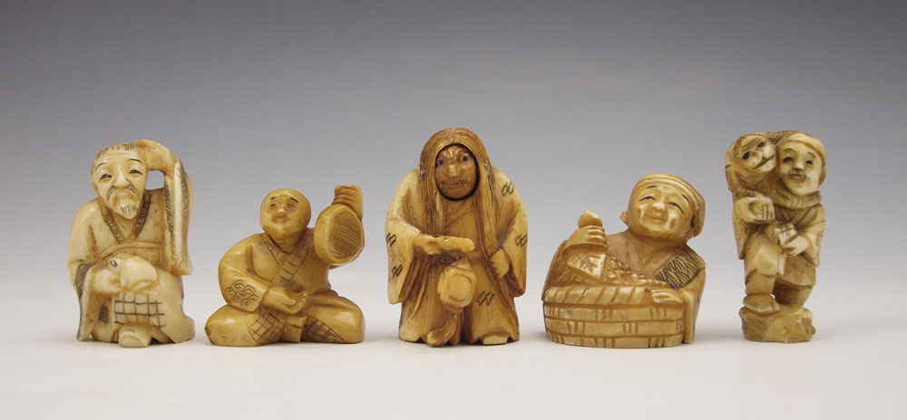5 PIECE CARVED IVORY & BONE NETSUKE: To include 1) Articulated face ivory man, signed, 1 5/8''. 2) Bone man with monkey, signed, 1 5/8''. 3) Bone man with basket, singed, 1 3/8'' h. 4) Bone man with turtle, signed, 1 1/2'' h. 5) Bone mane with flask, signed, 1 1/8''.