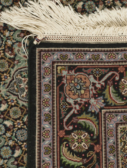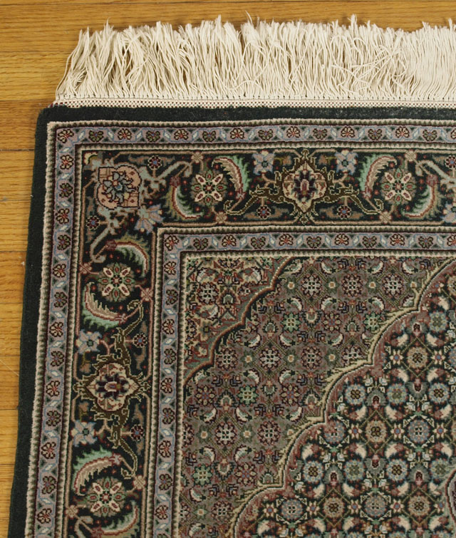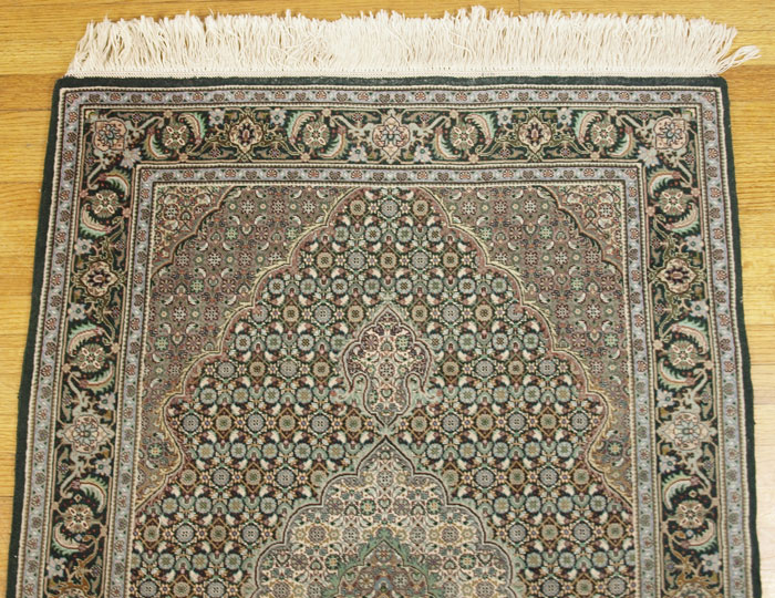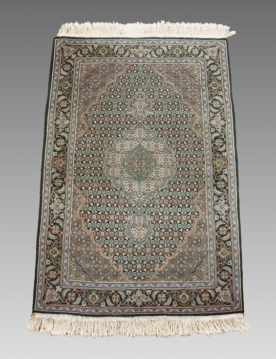 ARDEBIL PATTERN VERY FINELY HAND KNOTTED WOOL RUG, 3' 5'' x 5' 1'': Almost Qum or Nain quality, this weaver used an unusual palette of colors that include a variety of greens, blues, lavenders and yellows in a small patterned design that blends the colors together.