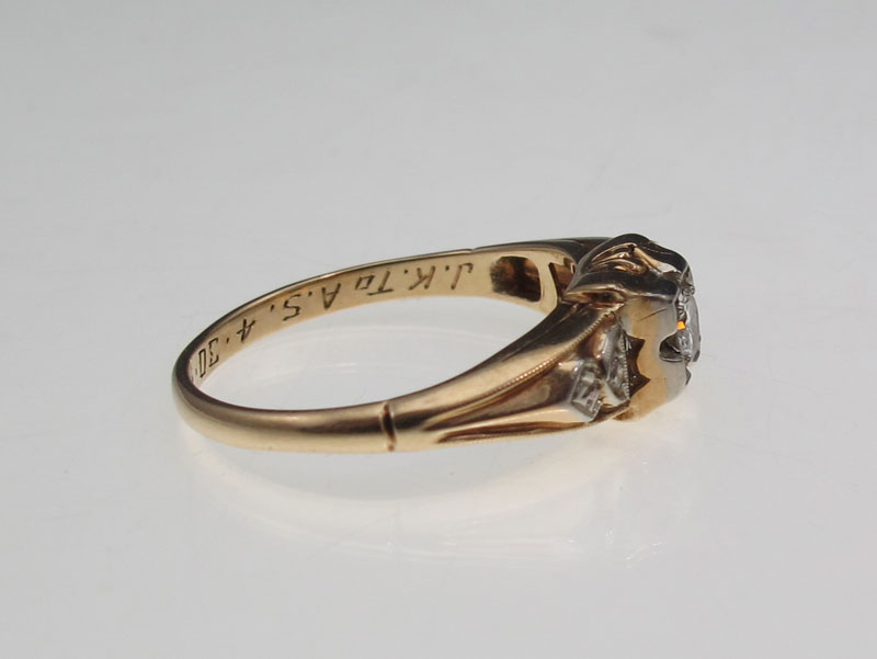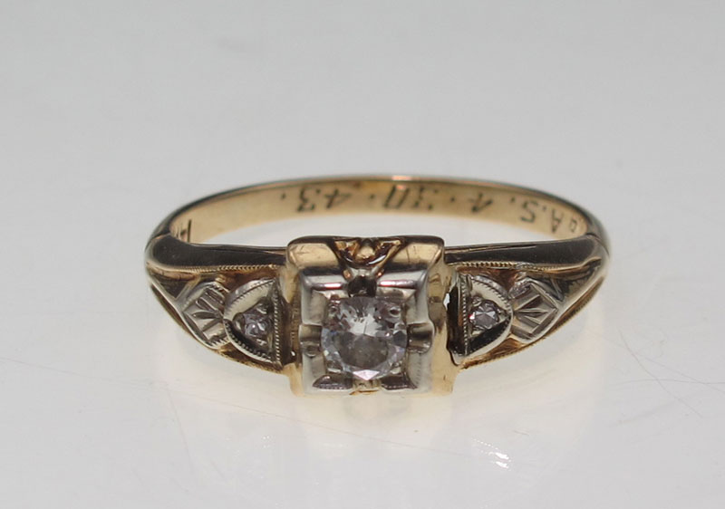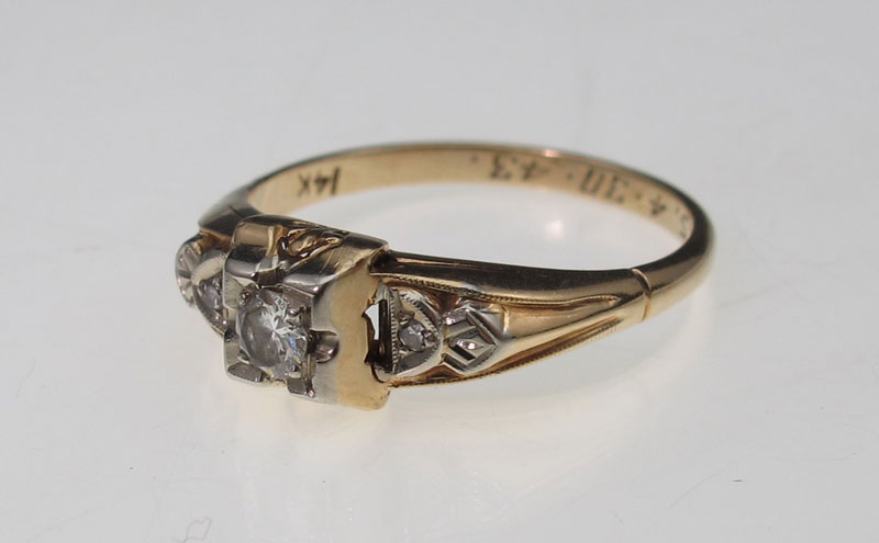 14K RETRO DIAMOND ENGAGEMENT RING: 14K yellow gold ring contains one round brilliant cut diamond and two round single cut diamonds. WEIGHT: .15 Ct. Approx. the diamonds average VS in clarity and H-I in color. The diamonds are prong set. Weight: 1.9 Size: 6
