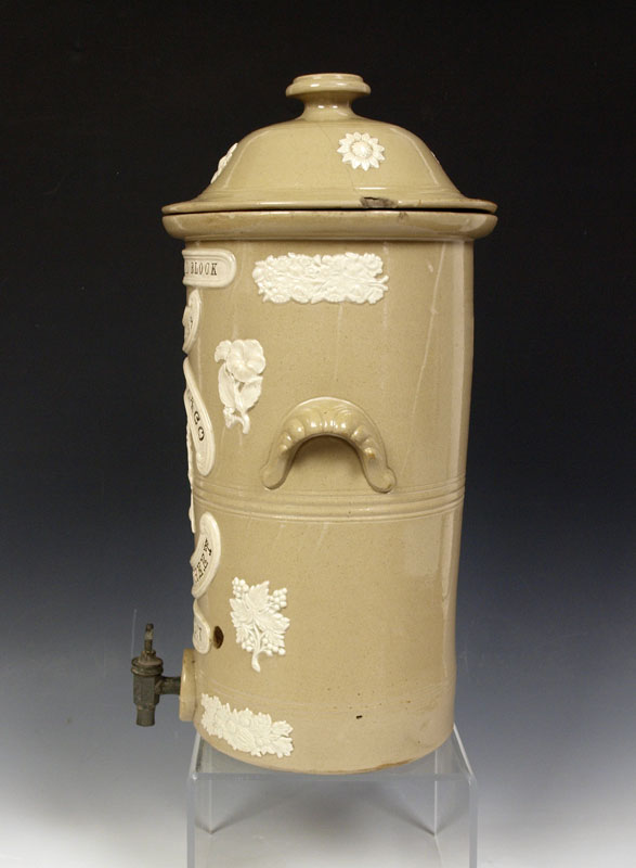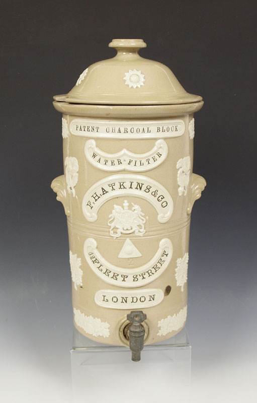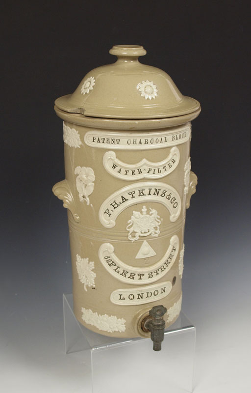 ENGLISH STONEWARE WATER FILTER WITH SPIGOT: FH Atkins, London. Patent charcoal block water filter. 19'' tall x 9 3/4'' dia.