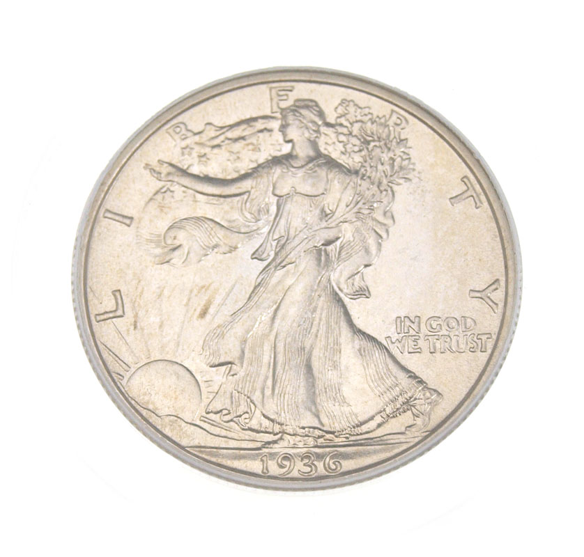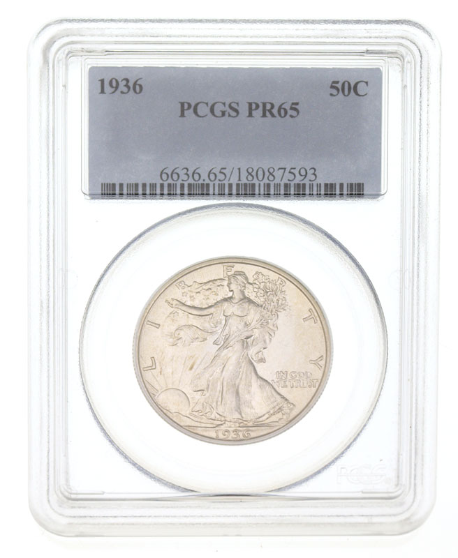 1936 WALKING LIBERTY HALF DOLLAR PCGS PR65: Slabbed and graded Walking Liberty half dollar. Proof 65 grade. Est. $3800/4200**
