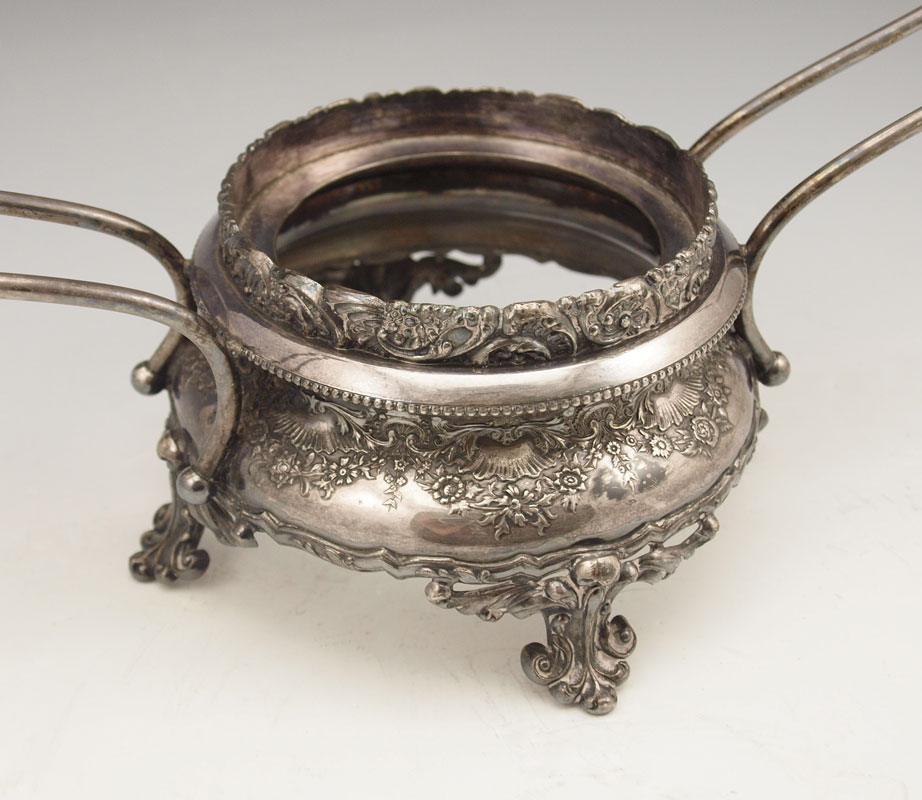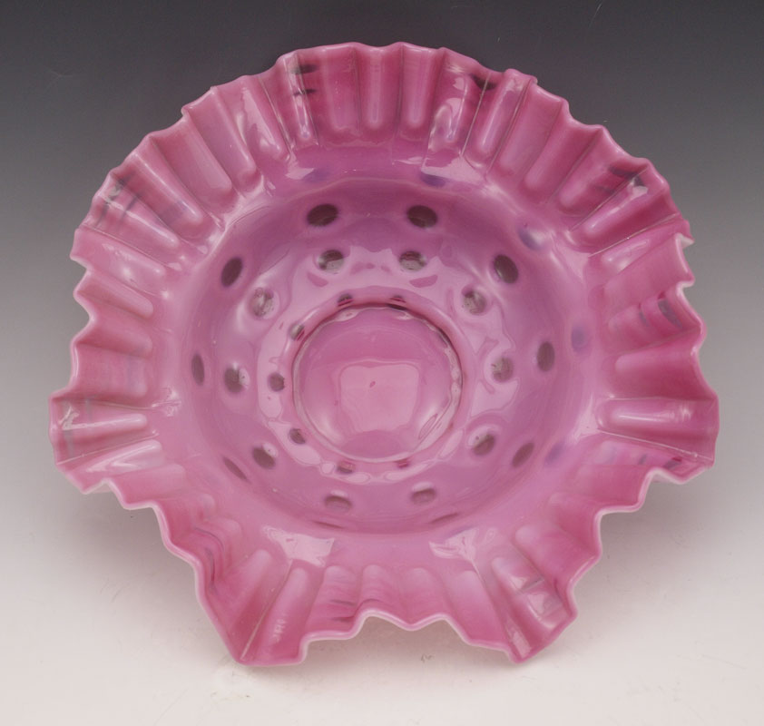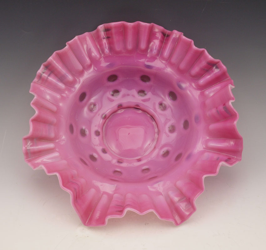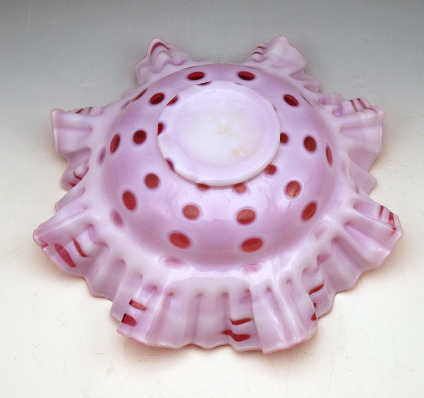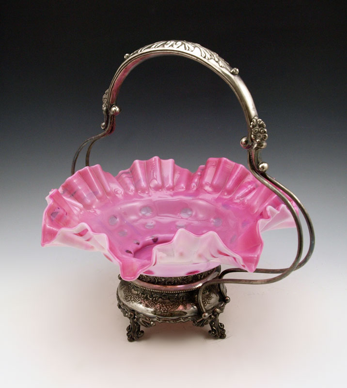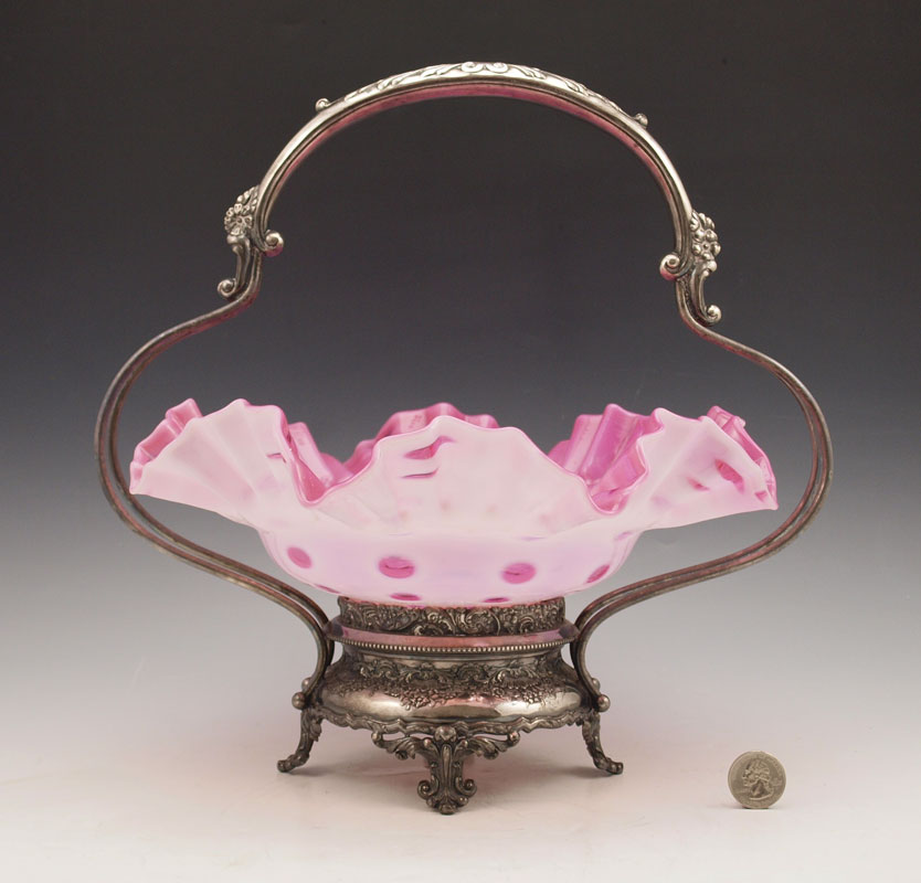 VICTORIAN CRANBERRY OPALESCENT COIN SPOT ART GLASS BRIDES BASKET: Meriden silverplated stand, 10 1/2'' dia.