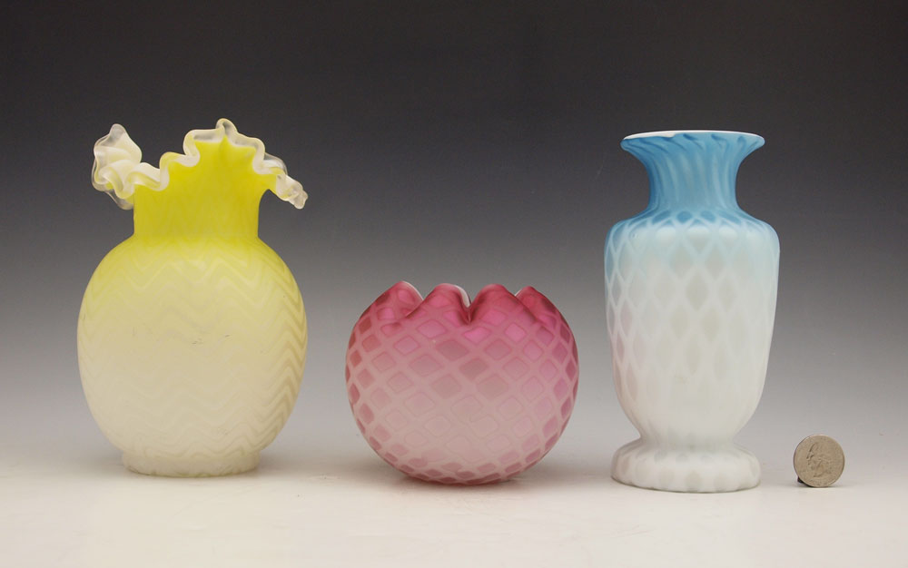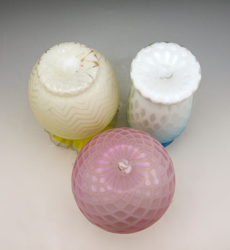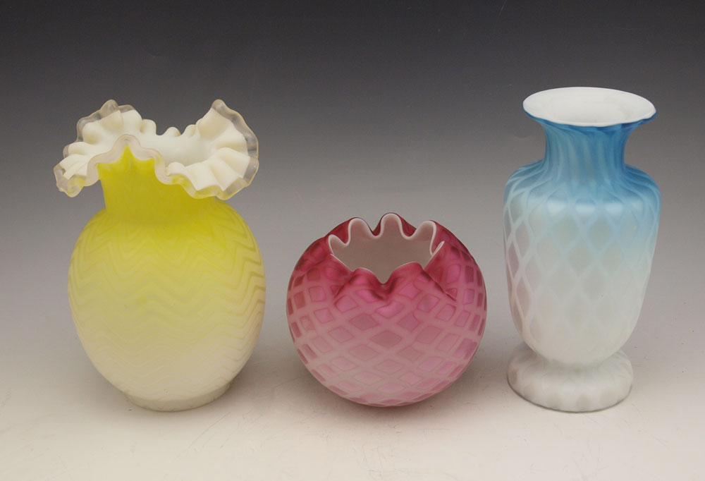 3 SATIN QUILTED ART GLASS VASES: Pink, yellow and blue, 3 1/2'' - 6 1/4'' h.