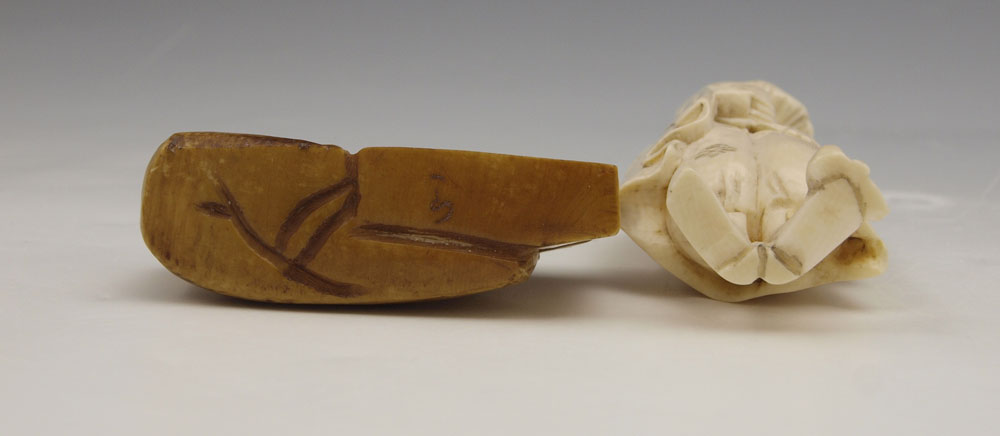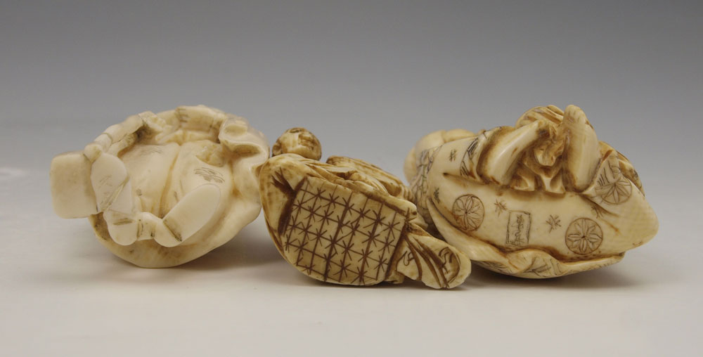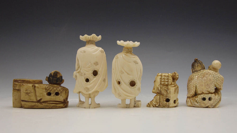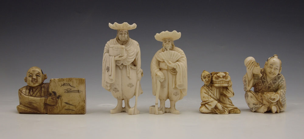 5 PIECE CARVED IVORY FIGURES NETSUKE: To include 1) Distinguished man with fan, unsigned, 2 3/8'' h. 2) Distinguished man with box, unsigned, 2 1/2''. 3) Seated man with gourd and cup, signed, 1 3/4'' h. 4) Seated artist, signed, 1 3/8''. 5) Seated man with mask, signed, 1 1/4''.