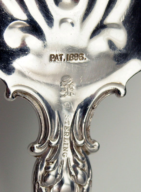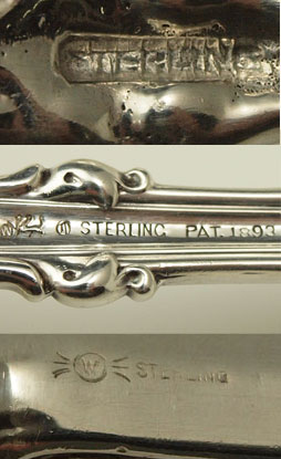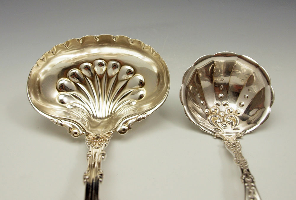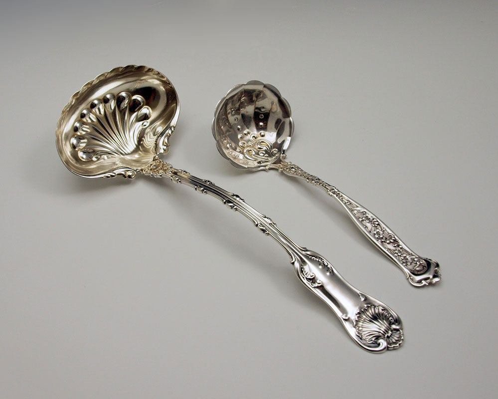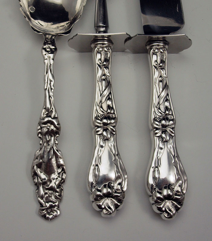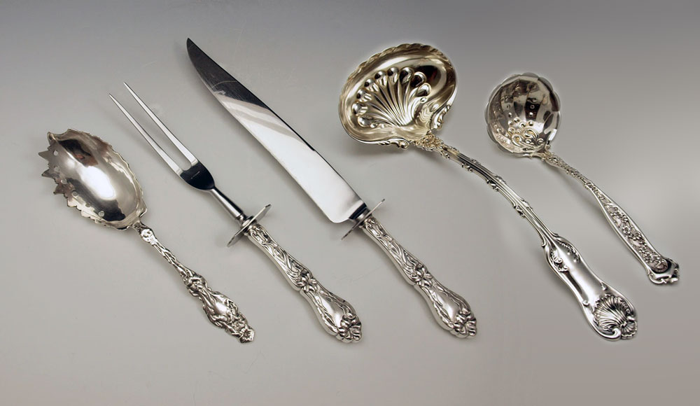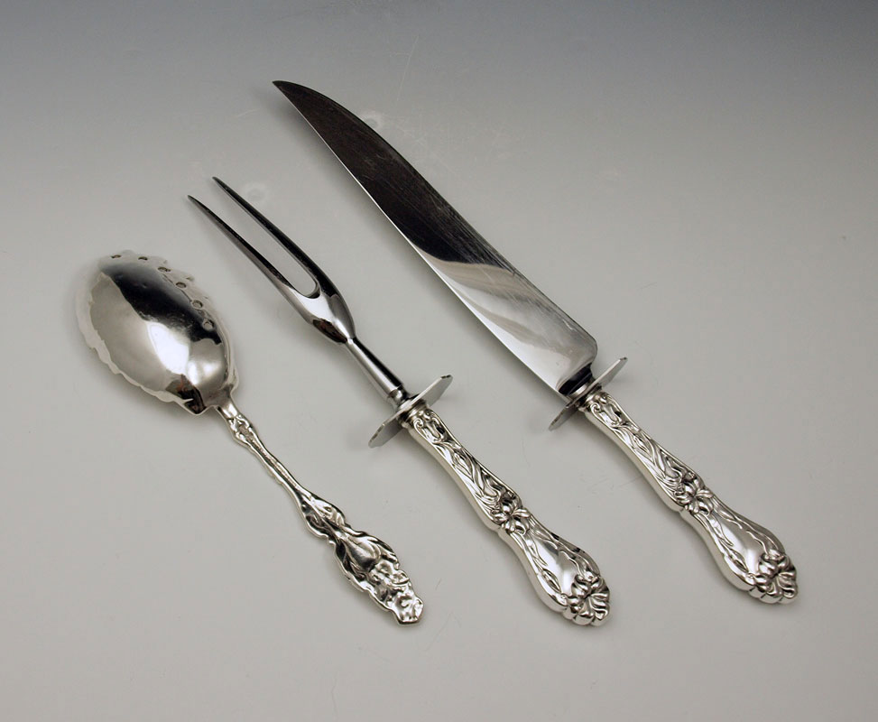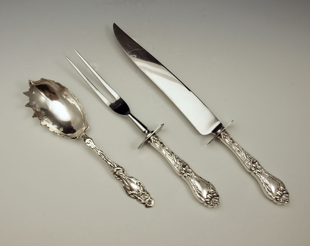 ESTATE STERLING SERVING PIECES AND CARVING SET: To include 1) Gorham salad serving set with engraved floral decoration. Fork 10 3/8'', spoon 10 3/4''. 2) Whiting gravy ladle 10 5/8''. 3) Whiting cream ladle 7 3/8'' 4) Unmarked as to maker, sterling vegetable server, 9 1/4''. 5) Whiting sterling handle carving set fork 11 1/4'' , knife 13 5/8''. Approx. 17 troy oz.