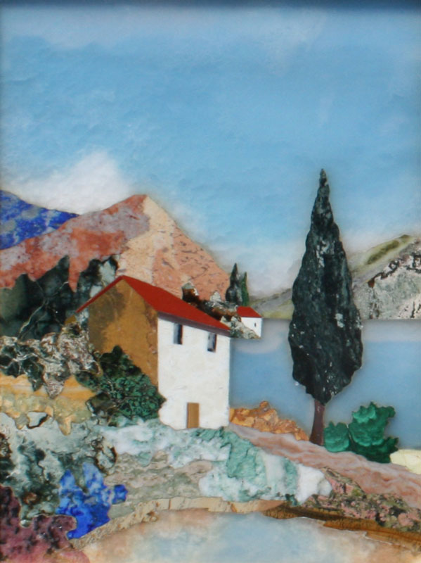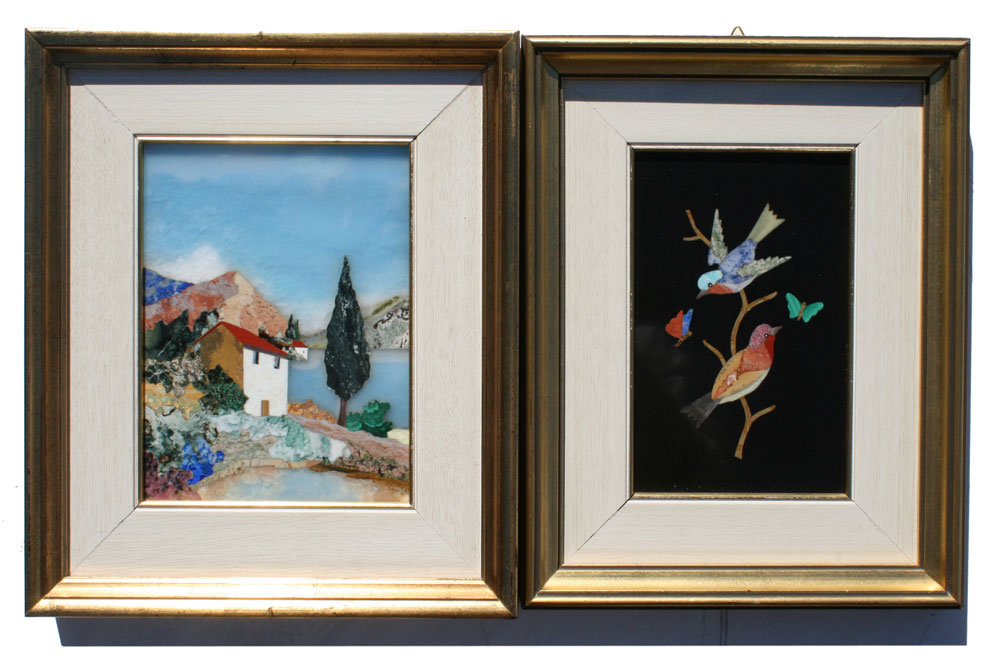 TWO PIECE MICRO MOSAIC POLISHED STONE ARTWORK: To include 1) Nature Still Life with Two Birds and Two Butterflies, sight size 7 1/4'' x 4 3/4'', framed, 12 1/2'' x 9 1/2''. 2) Italianate Lakeside Landscape, 7 1/2'' x 5 1/2'', framed, 12 1/2'' x 10 1/2''. Est. $400/600**