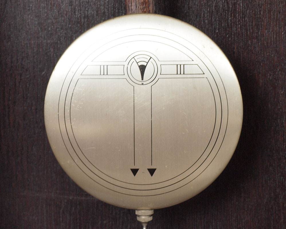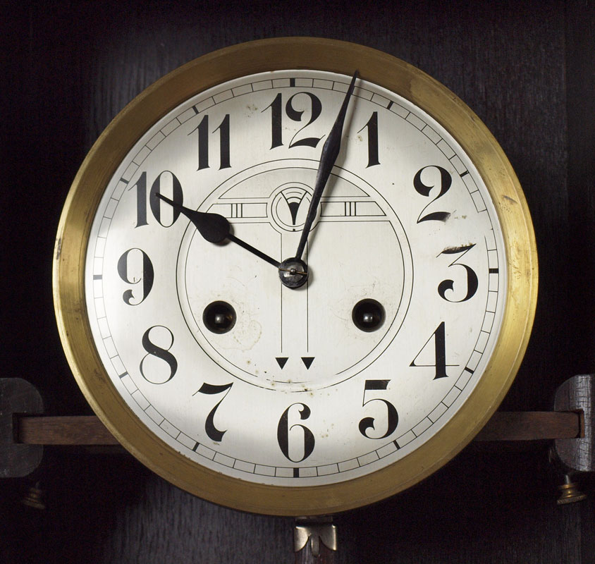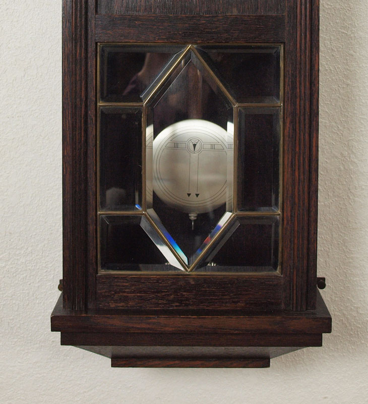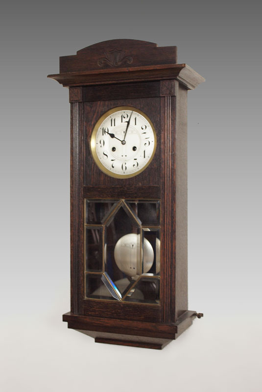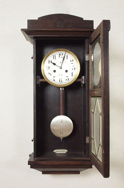 JUNGHANS GERMAN WALL CLOCK: Wood case with beveled leaded glass bottom of door. Mixed metal face with Arabic numerals. Marked Junghan on time and strike movement. Key in office. 31'' x 14 1/4'' x 7 5/8''.