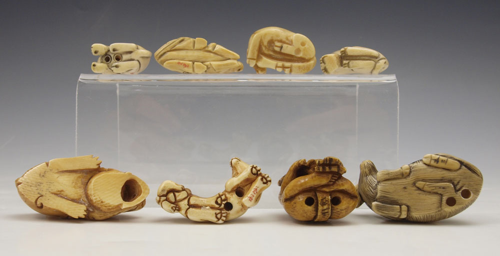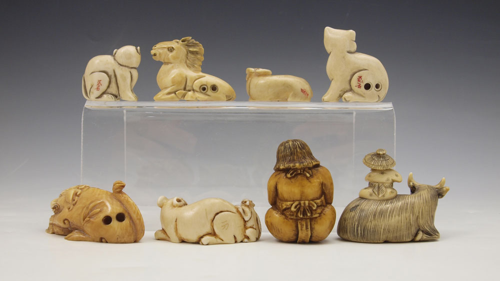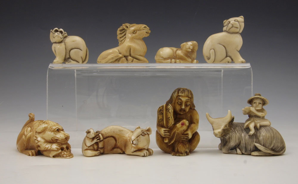 8 PIECE CARVED IVORY MINIATURE NETSUKE: To include 1) Monkey, signed, 7/8'' h. 2) Cat, signed, 1 1/4''. 3) Yak, signed, 5/8'' h. 4) Pair of rats, signed, 5/8''. 5) Foo dog, unsigned, 7/8''. 6) Boy on Yak, signed, 1 3/8''. 7) Horse, signed, 1''. 8) Woman with rabbit and fan, signed, 1 1/2''.
