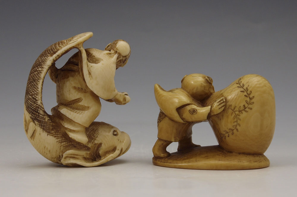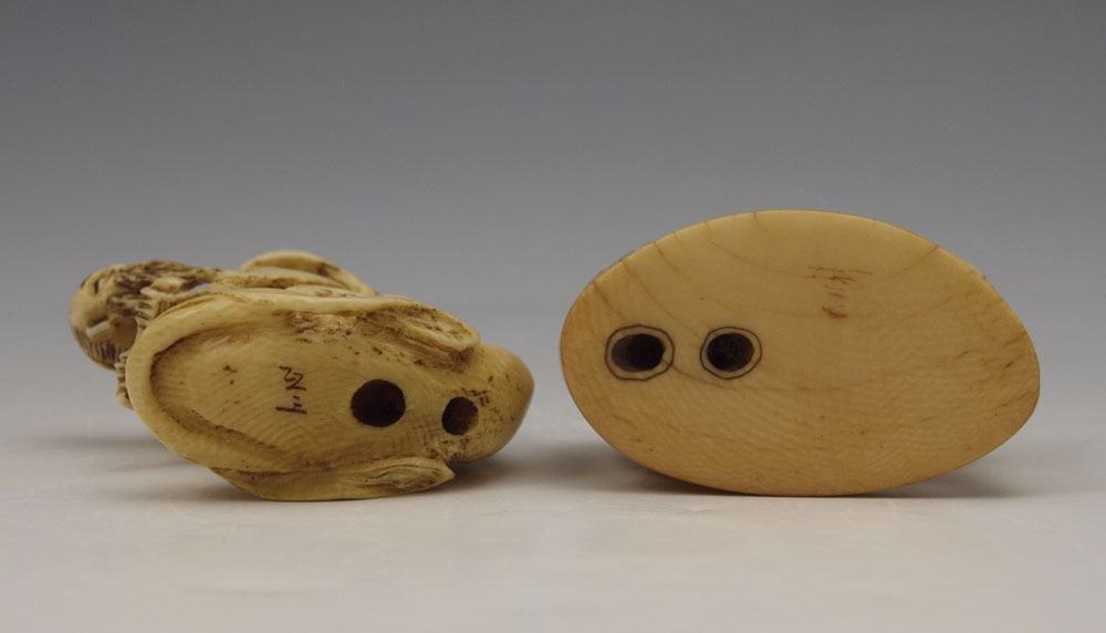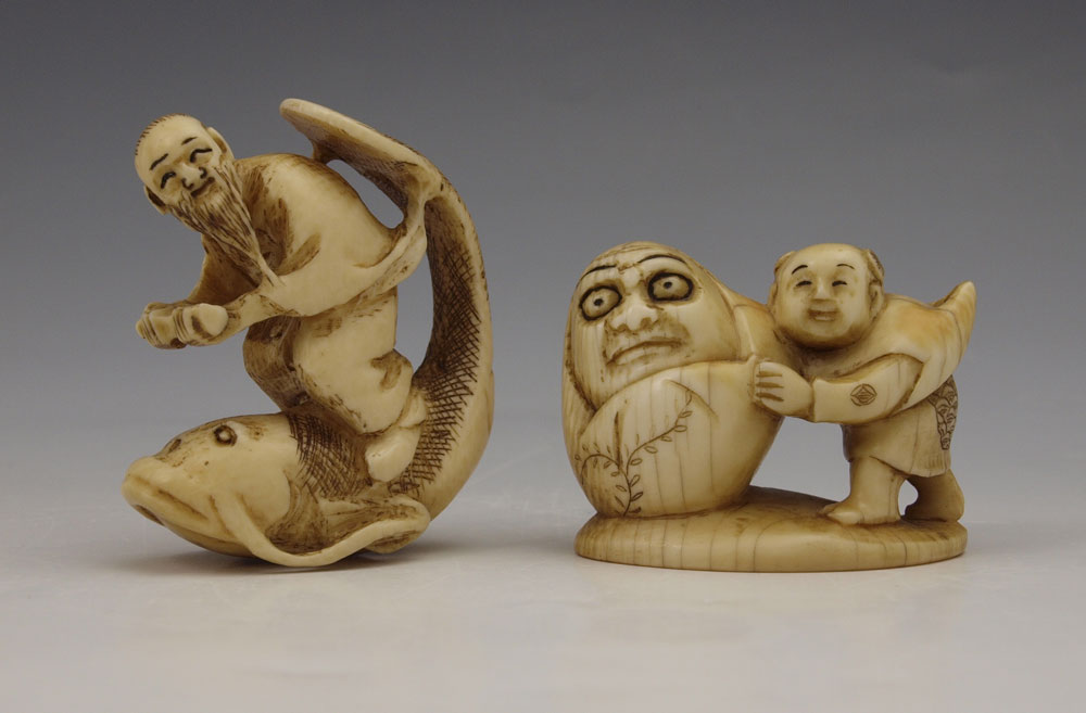 2 PIECE CARVED IVORY MAN ON FISH, FIGURES NETSUKE: To include 1) Man riding fish, signed, 2'' h. 2) Man with mythological creature, unsigned, 1 1/2'' h.