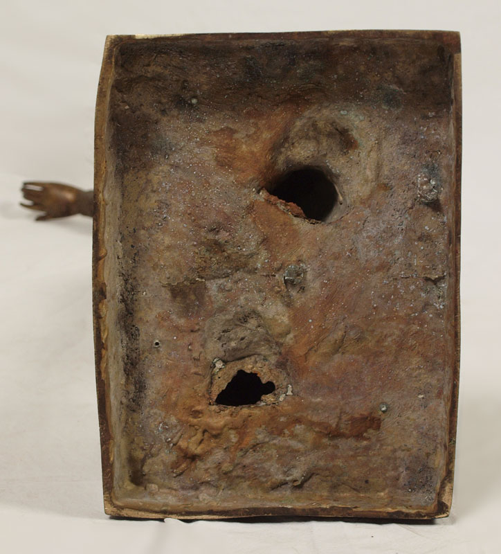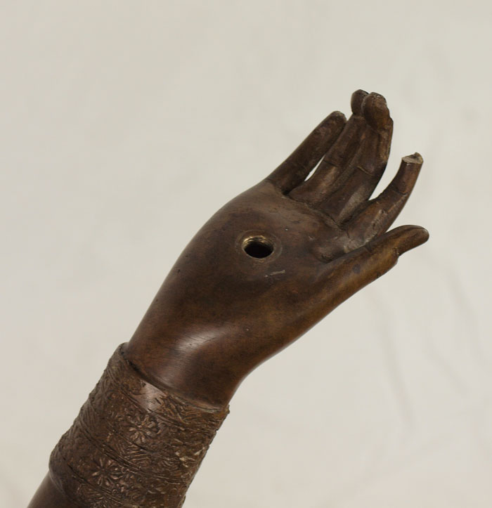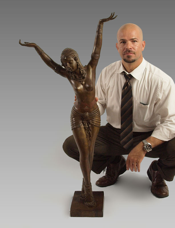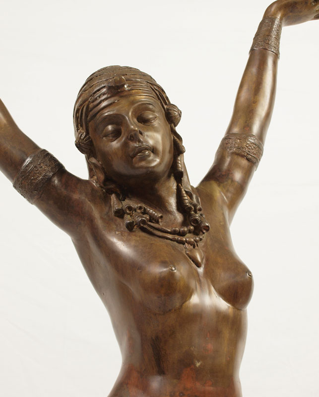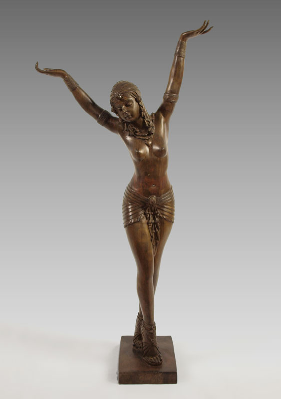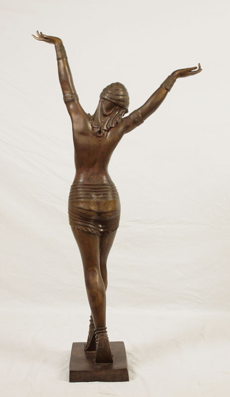 LARGE ART DECO SEMI NUDE BRONZE FIGURE: Later 20th C. figure in dance position. She does have threaded holes in the tops of her hands. Approx. 46 1/2''h. x 22'' wide. Please note loss of finger tip.