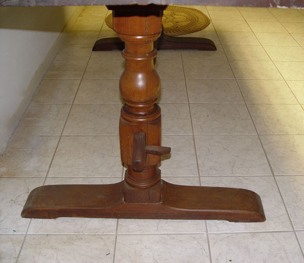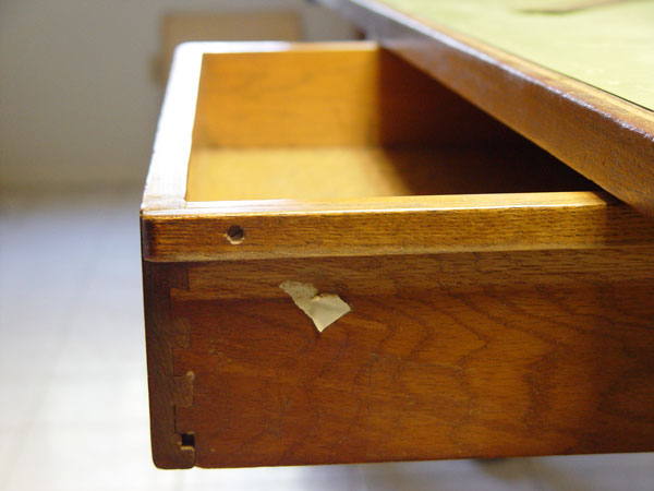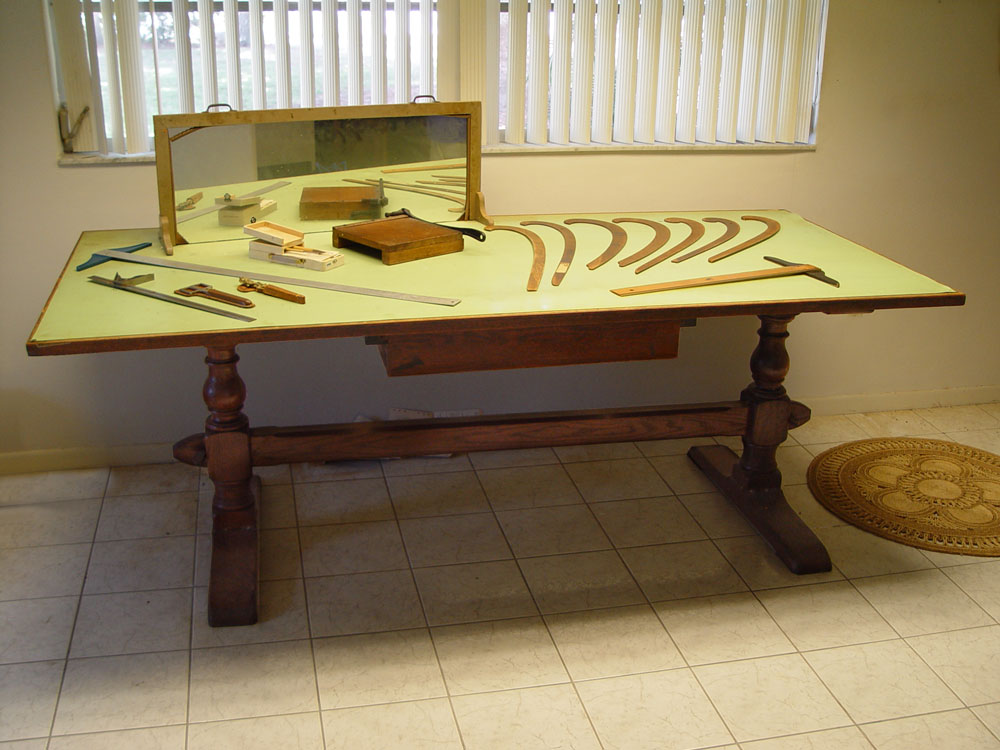 THE PERSONAL WORK TABLE AND TOOLS OF FURNITURE DESIGNER RAY SOBOTA: Double oak pedestal base, single drawer. Large in proportion at 35'' h. x 95'' long x 43 1/2''.