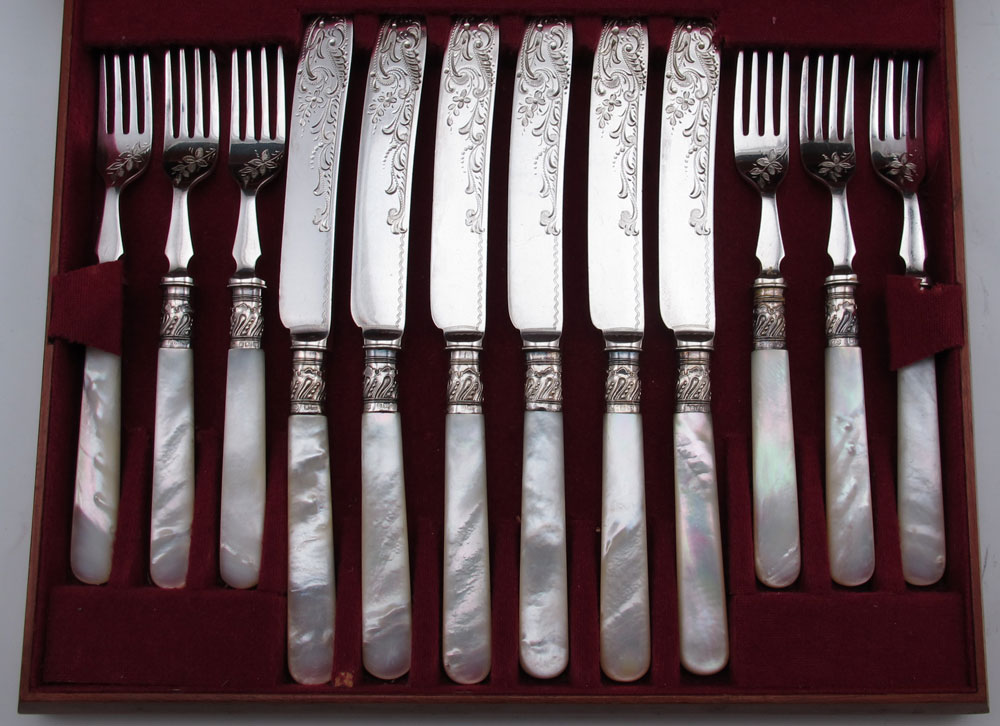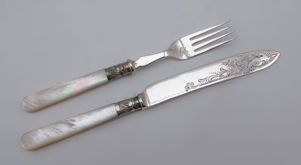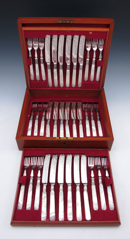 MOTHER OF PEARL HANDLE FISH SET IN PRESENTATION BOX: William Hutton & Sons 18 piece fish set with engraved design on blades and tines, mother of pearl handles. Forks 6 1/2'', knives 8''. Sold with wood presentation case. 3 1/4'' x 11 3/8'' x 9 3/4''.