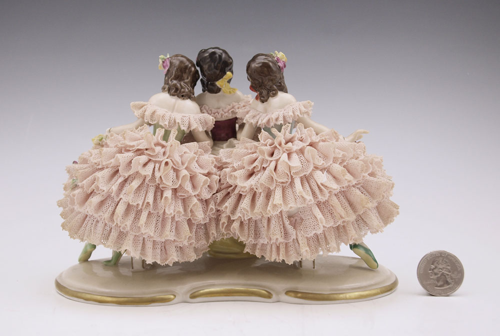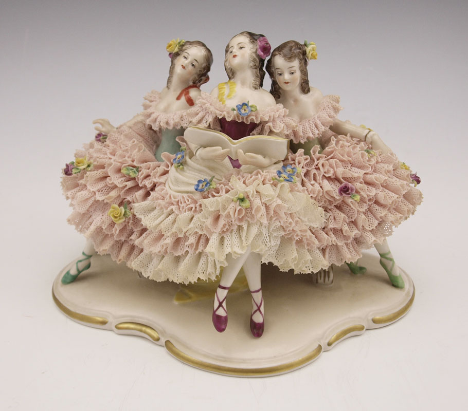 VOLKSTEDT LACY FIGURINE GROUP: Three seated figures in delicate dresses. Approx. 6''h. x 7 3/4''.