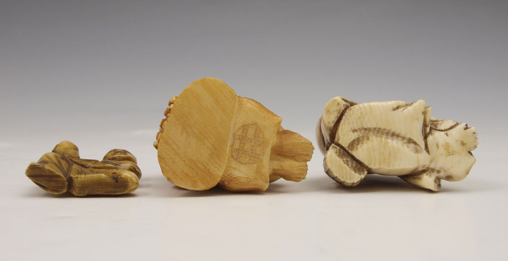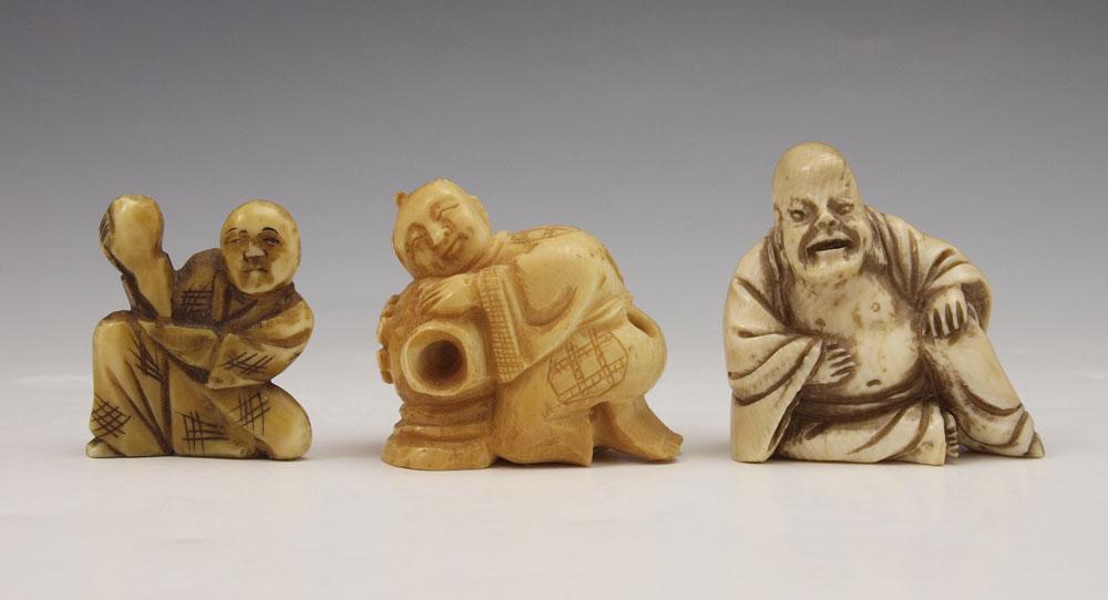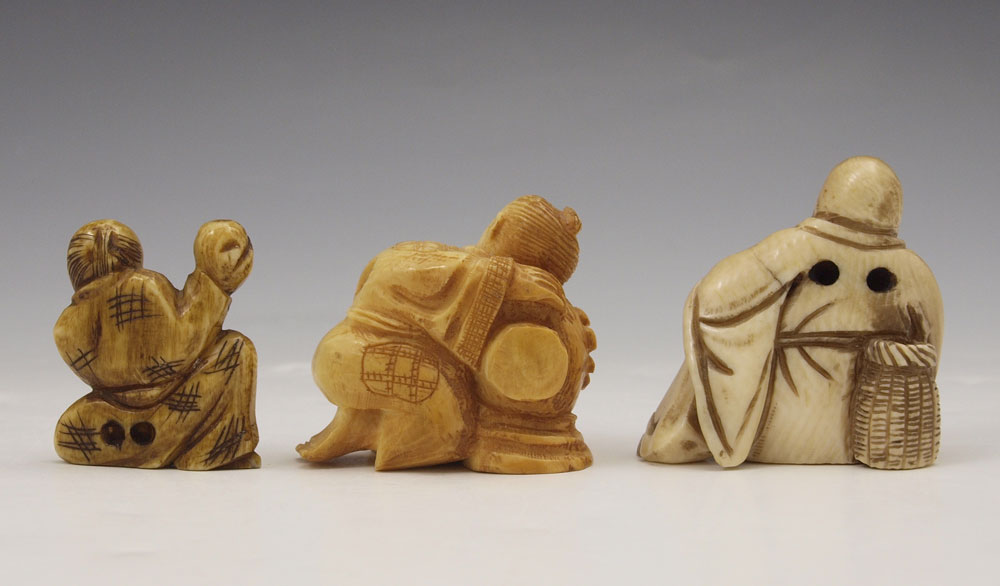 3 PIECE CARVED IVORY FIGURES NETSUKE: To include 1) Sleeping man on drum, unsigned, 1 1/2''. 2) Reclining Buddha? with basket 1 1/2''. 3) Man with gourd, 1 1/4''.