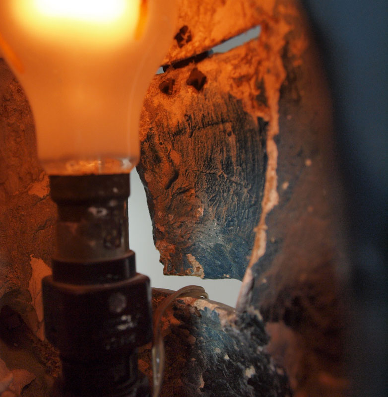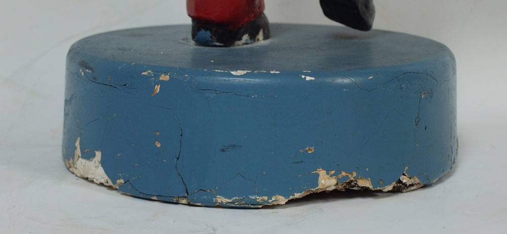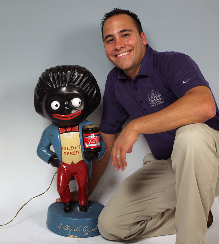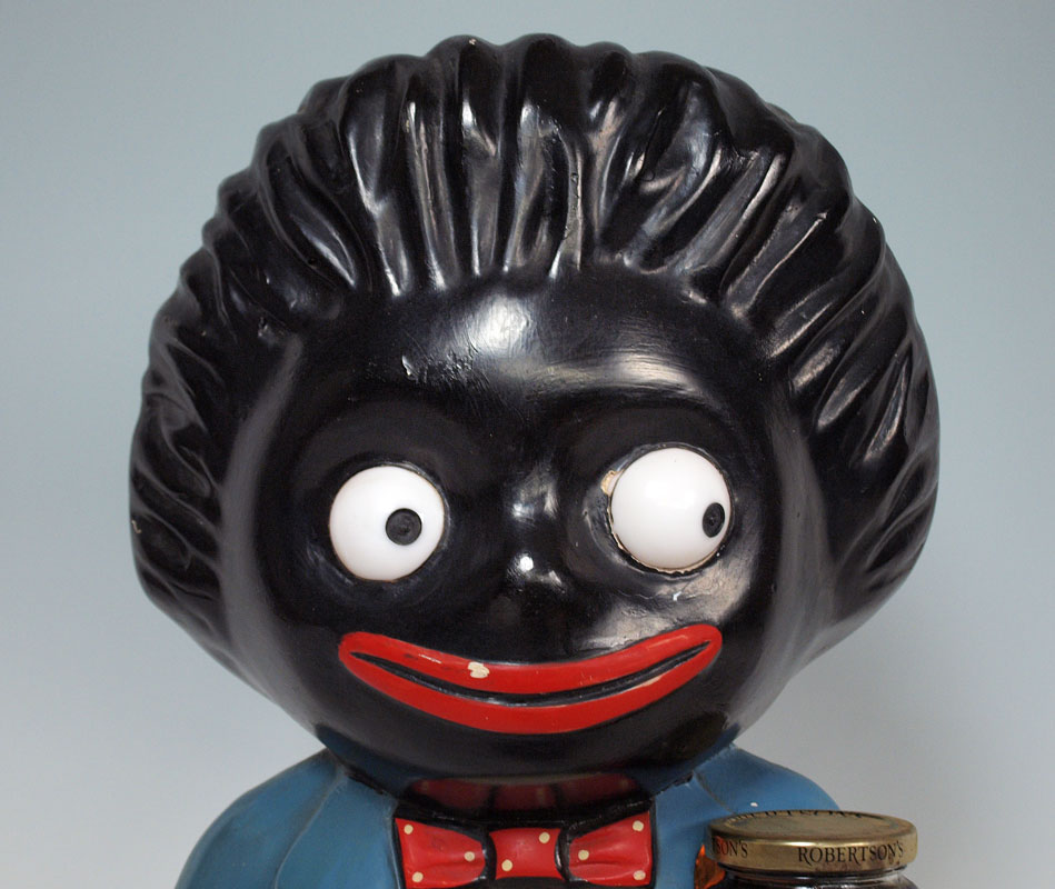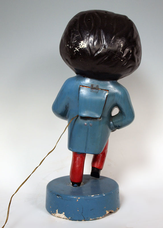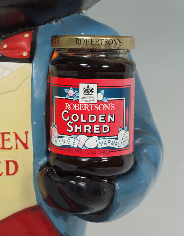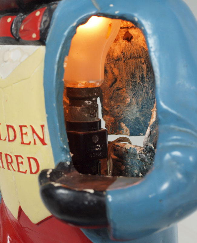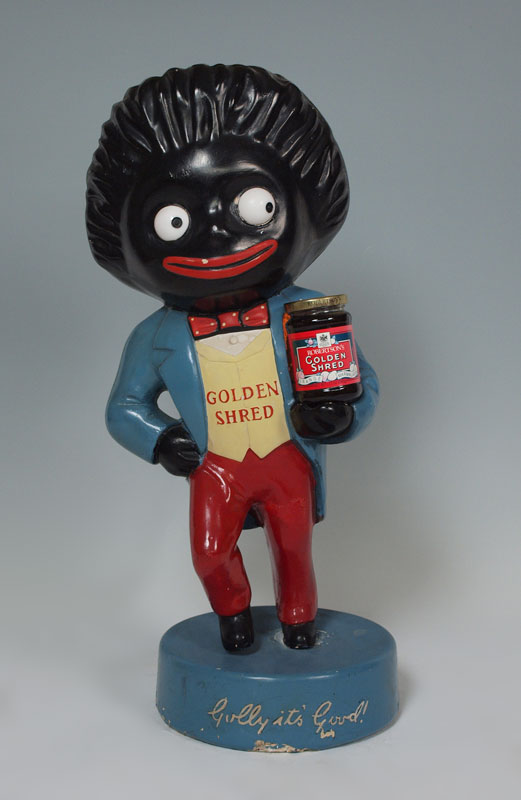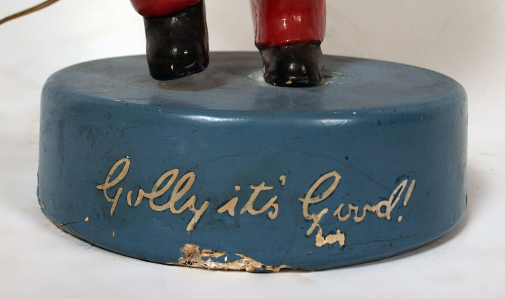GOLDEN SHRED GOLLY ADVERTISING FIGURE: ''Golly Its Good'', referring to Robertsons Marmalade and jams. Plaster figure with illuminated interior. Approx. 28'' tall, the base 10 1/2'' dia. Painted plaster, with chips along the bottom.