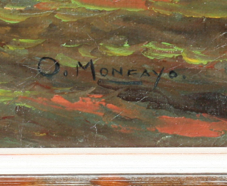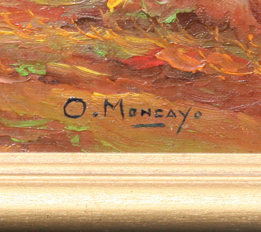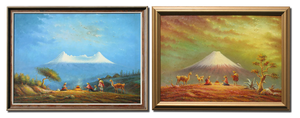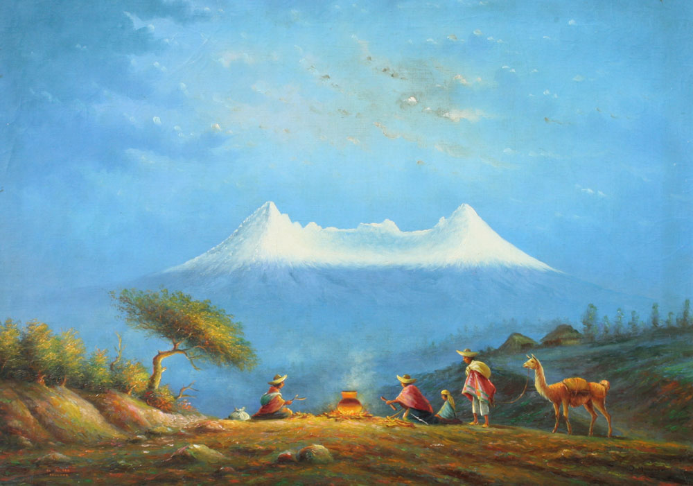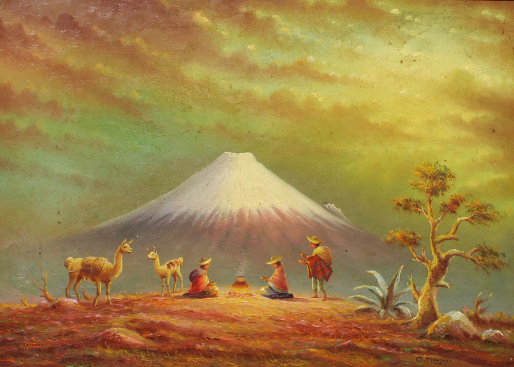 TWO ECUADORIAN SNOW CAP MOUNTAIN LANDSCAPES WITH CAMPERS AND LLAMA AROUND A CAMPFIRE IN THE FOREGROUND SIGNED MONCAYO: 1) OIL/Canvasboard, signed, sight size 23'' x 32'', framed, 26'' x 35 1/2''. 2) OIL/Canvasboard, signed, sight size 15'' x 21'', framed 18'' x 24''. Est. $300/500**