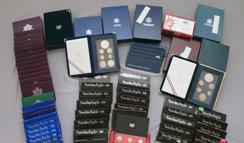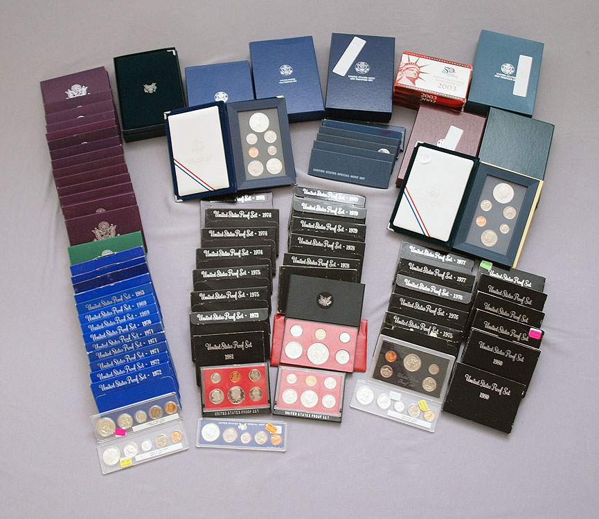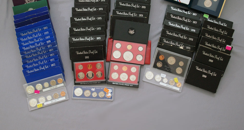 COLLECTION OF BOXED US COIN PROOF SETS: Most sets are in original boxes and cases. To include Approx. 57 presentation proof sets ranging from 1968-1997, 7 Prestige sets ranging from 1986-1993, 2001-2003 silver proof set, 10 special mint sets 1960-1967, 1776-1976 Silver Bicentennial. For more complete list with dates please email chris@burchardgalleries.com