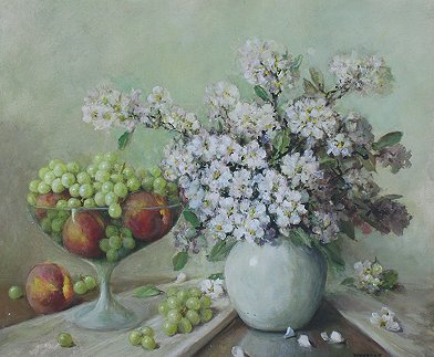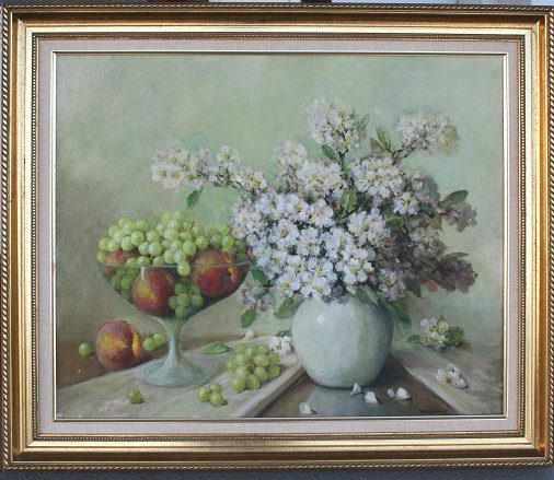 WOODRUFF, Leonard (American, 1880-1970): Fruit & Flower Still Life, 24'' x 30'', signed, signed and dated verso 1961, framed, 30'' x 36''.