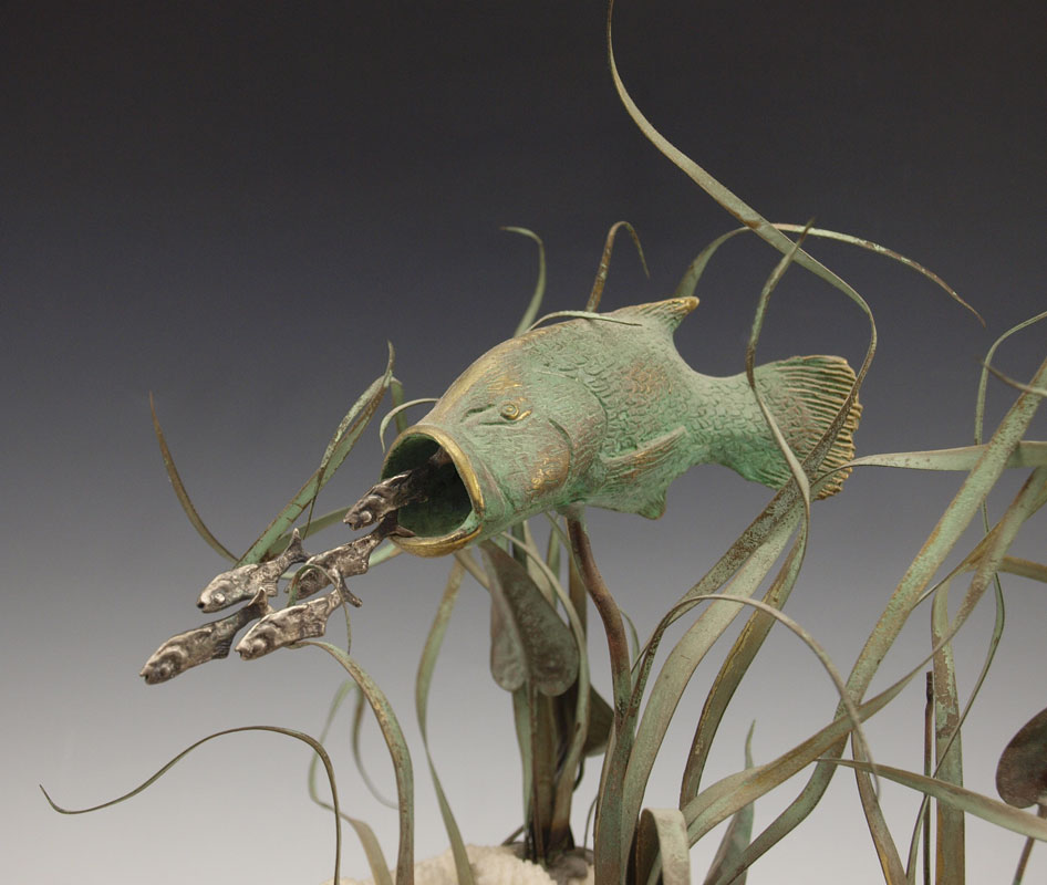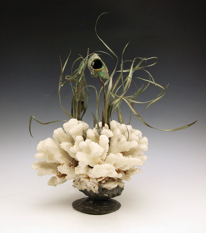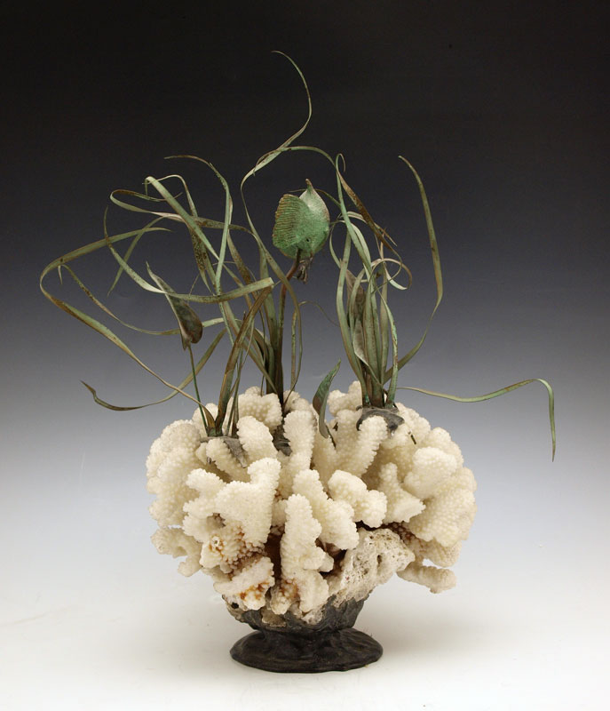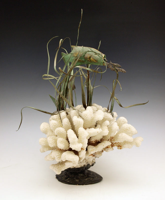 CORAL BRASS AND SILVER FISH & SEAGRASS SCULPTURE: Coral and metal base with patinated brass grouper and silver? bait fish. Unsigned. 16 1/2'' h. x 10 1/2'' dia.