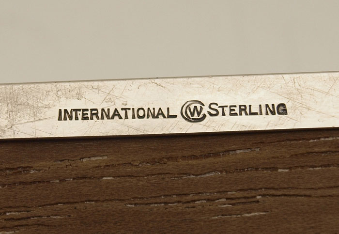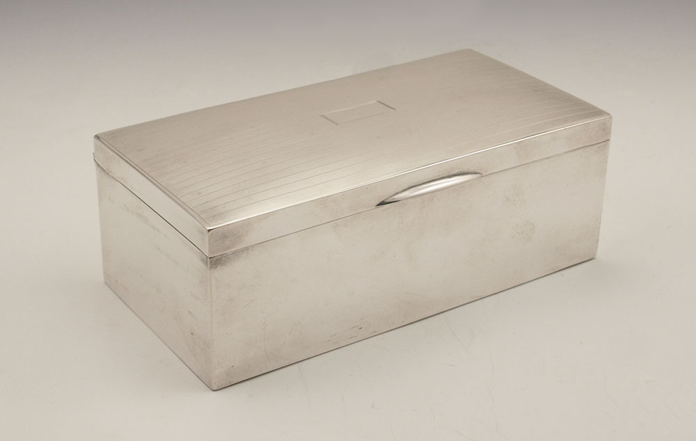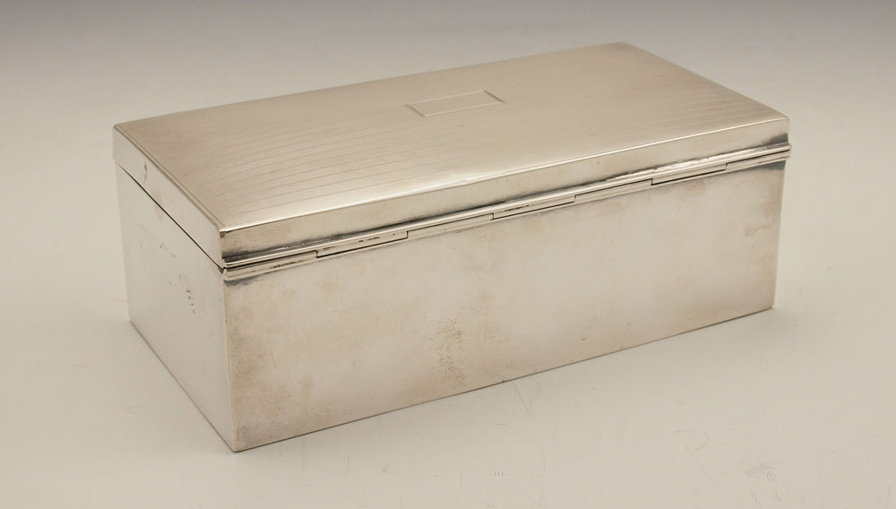INTERNATIONAL SILVER STERLING CIGARETTE BOX: Wood lined interior, engraved hinged top. 2 1/2'' h. x 6 1/2'' x 3 3/8''. Approx. 10 troy oz. weighed with wood inside.