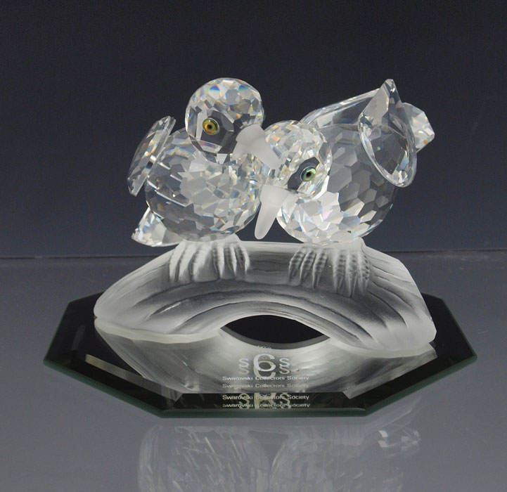 SWAROVSKI COLLECTORS SOCIETY 1989 AMOUR - THE TURTLEDOVES: Adi Stocker designer, 2 1/2''h., third in a series of Annual Editions, sold with SCS mirror, certificate and original round box, approx. 7 1/2'' x 7 1/4''dia.