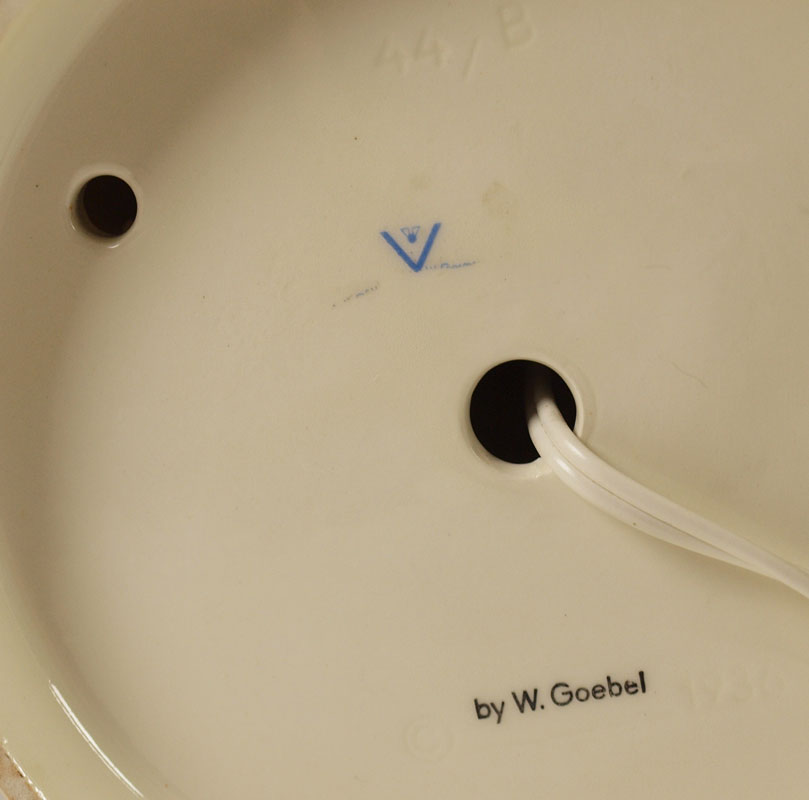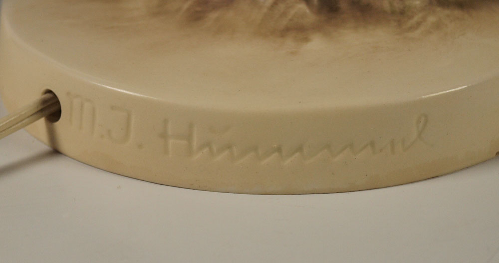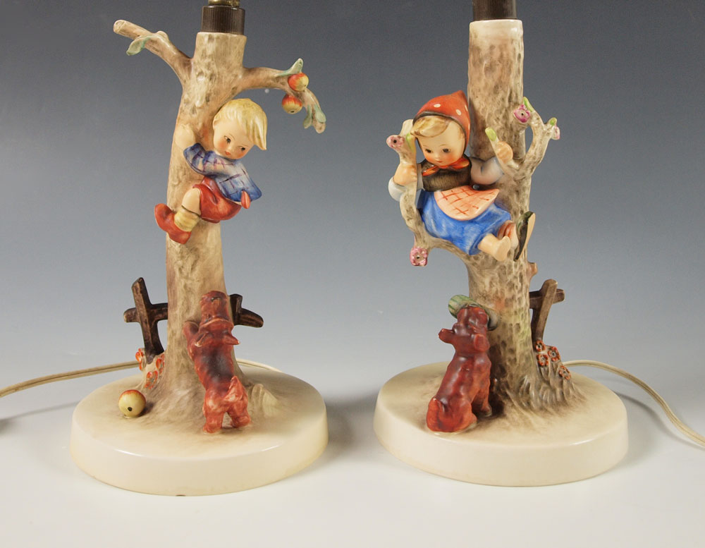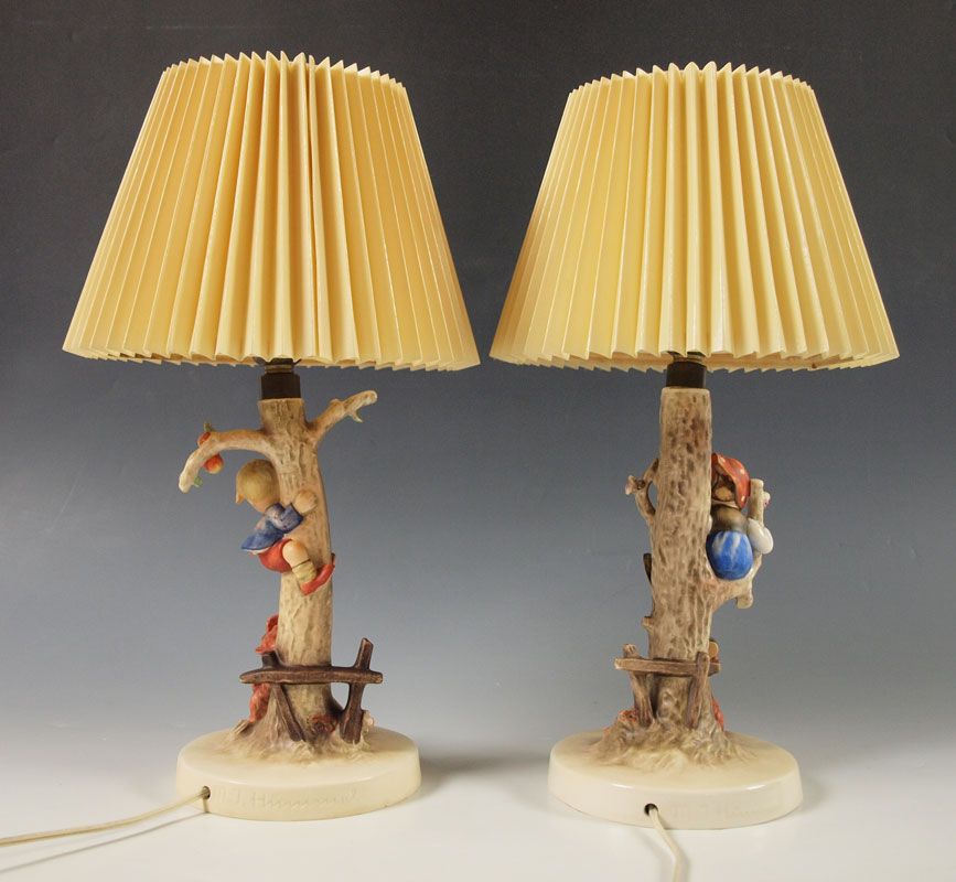 PAIR OF HUMMEL FIGURAL LAMPS: CULPRITS, impressed 44/A & 1935, stylized Bee & W.Germany mark, C by W. Goebel stamp, circa 1960-1963, lamp 11 3/4'', overall with current bulb and shade 15 3/4'', 5 5/8'' dia. base, under base rim chip; OUT OF DANGER, impressed 44/B, impressed C________1936 with by W. Goebel in the center, stylized Bee mark, lamp 12''h., overall with current bulb and shade 16''h., 5 3/4'' dia. base, tiny chips to dog ear and tail. Both lamps with European plugs and converters for use in the US.