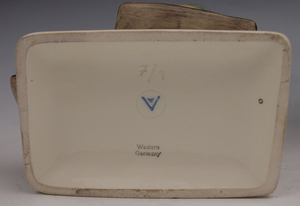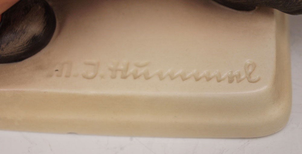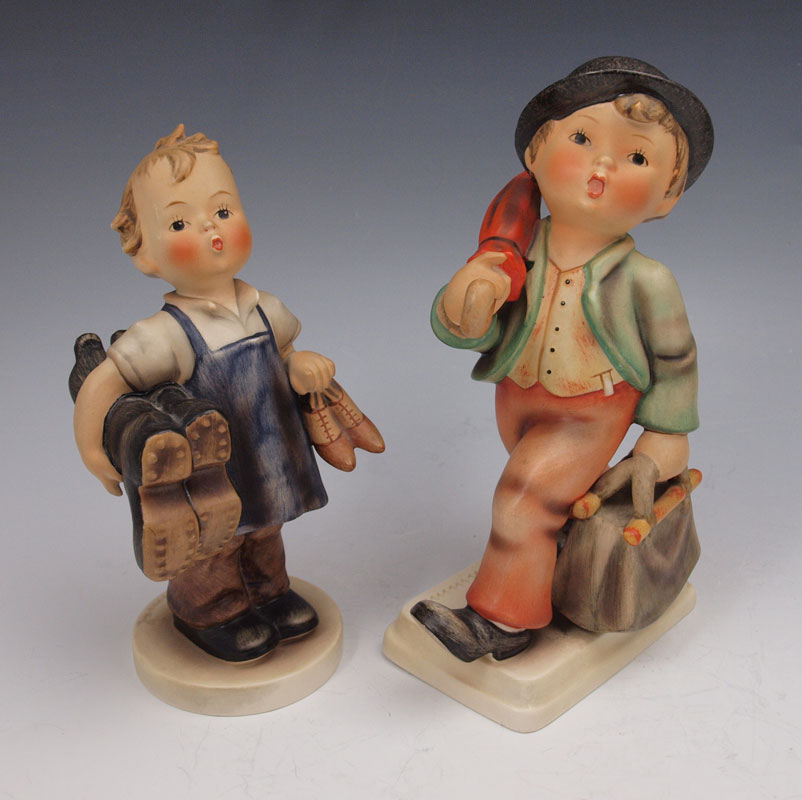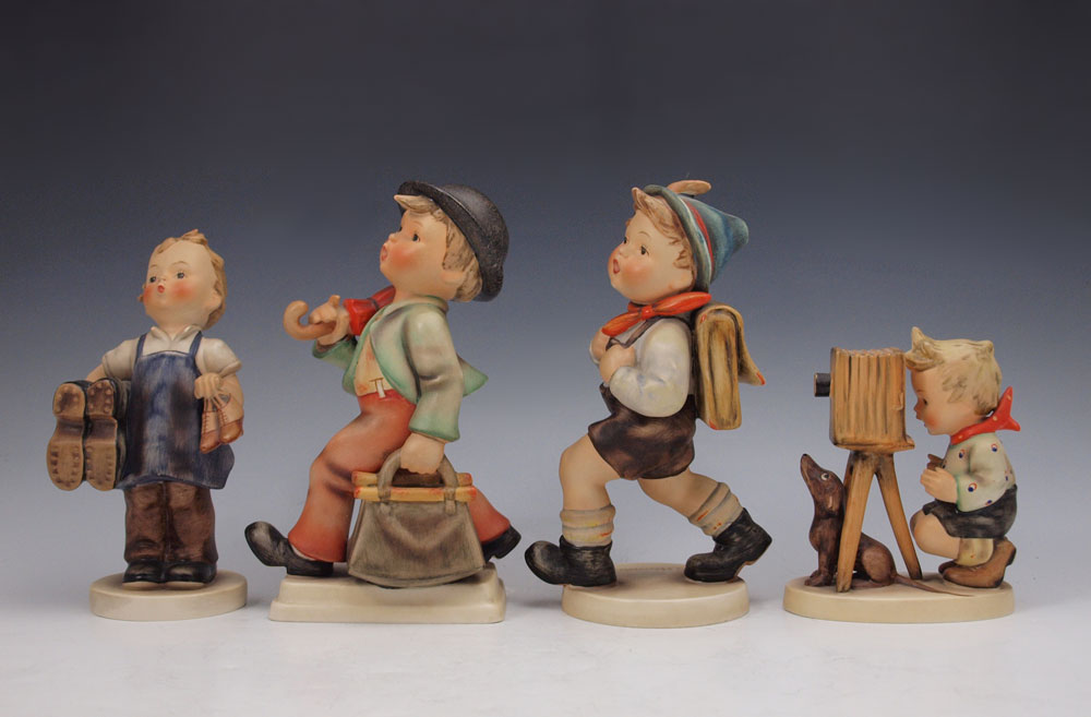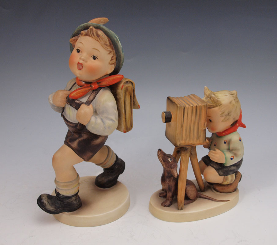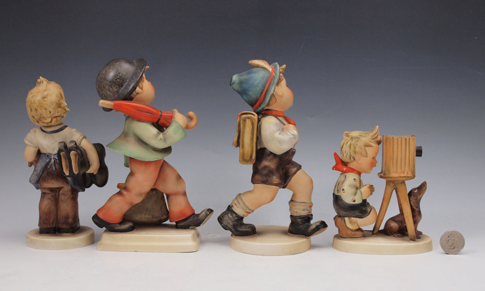 FOUR LARGE HUMMEL FIGURINES: To include 3 with the Stylized Bee & Western Germany mark, circa 1957-1960, MERRY WANDERER 7 1/2'' impressed 7/1; BOOTS 7'' impressed 143/1; SCHOOL BOY 7 1/2'' impressed 82/2; and THE PHOTOGRAPHER 5'', impressed 178, Stylized Bee & W. Germany mark, circa 1960-1963. Sold as a lot.