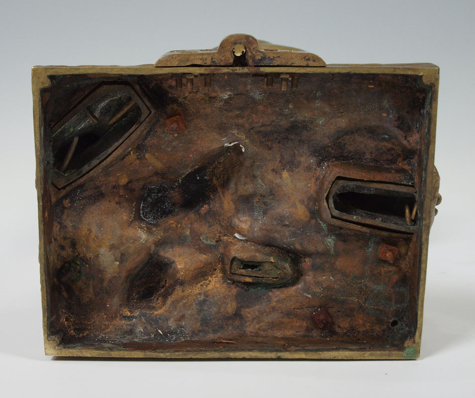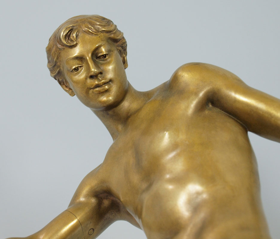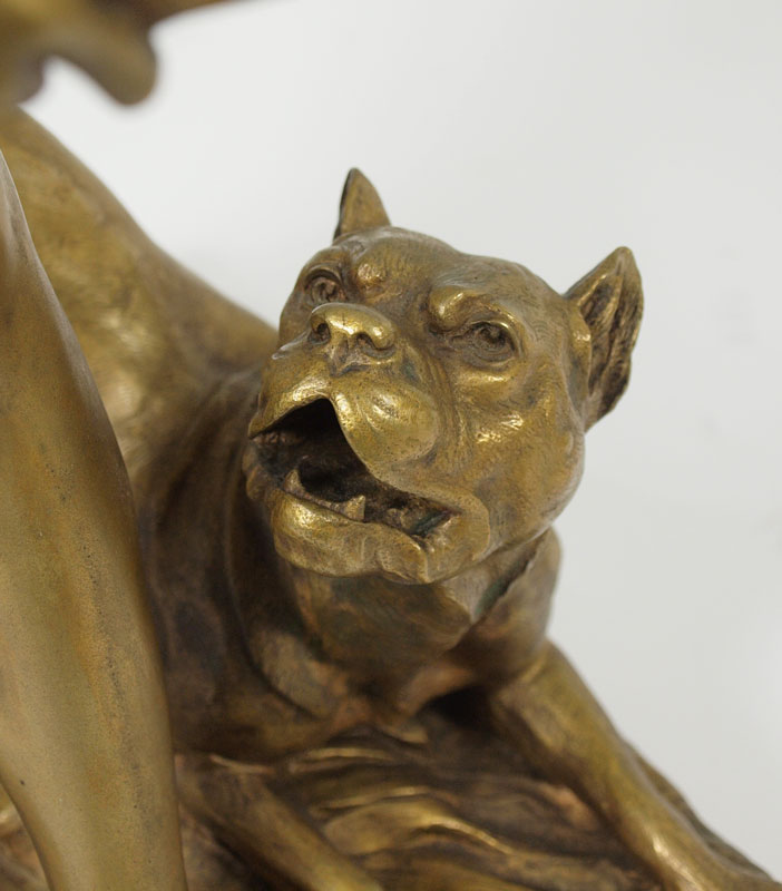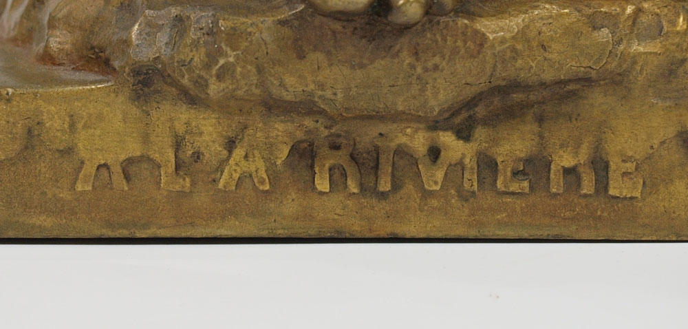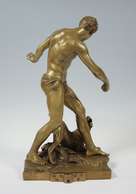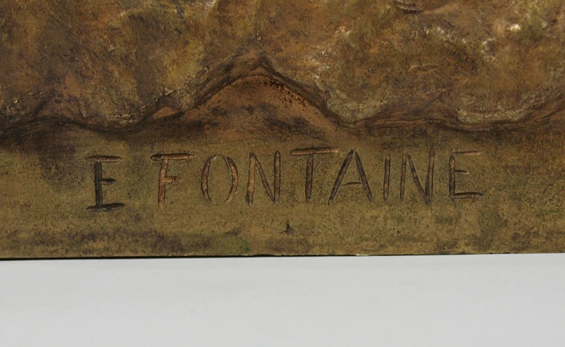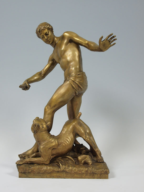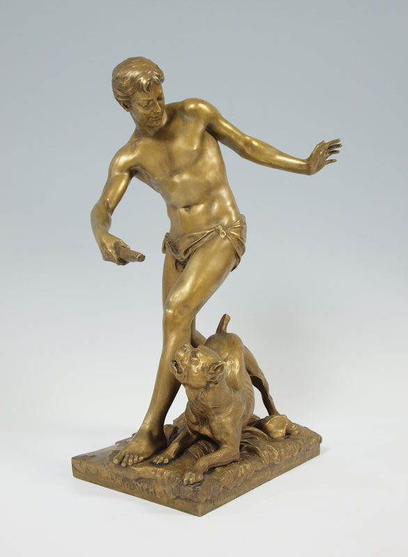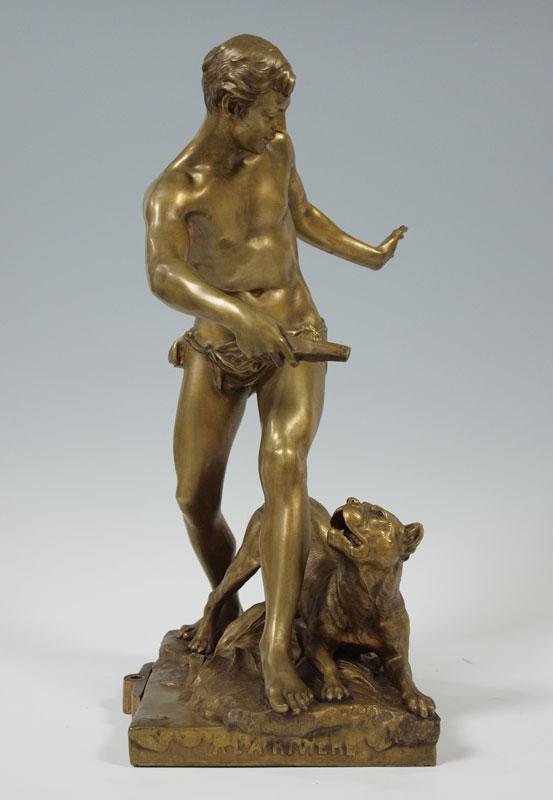 FONTAINE, Emmanuel, (French, 1857-1933): Boy with Dog, Patinated Bronze, 20 1/2 h. x 8 1/2'' x 12'', incised signature, A La Riviera. Bronze converted to, and then from a lamp; evidence of mounting hardware. Est. $2000/4000**