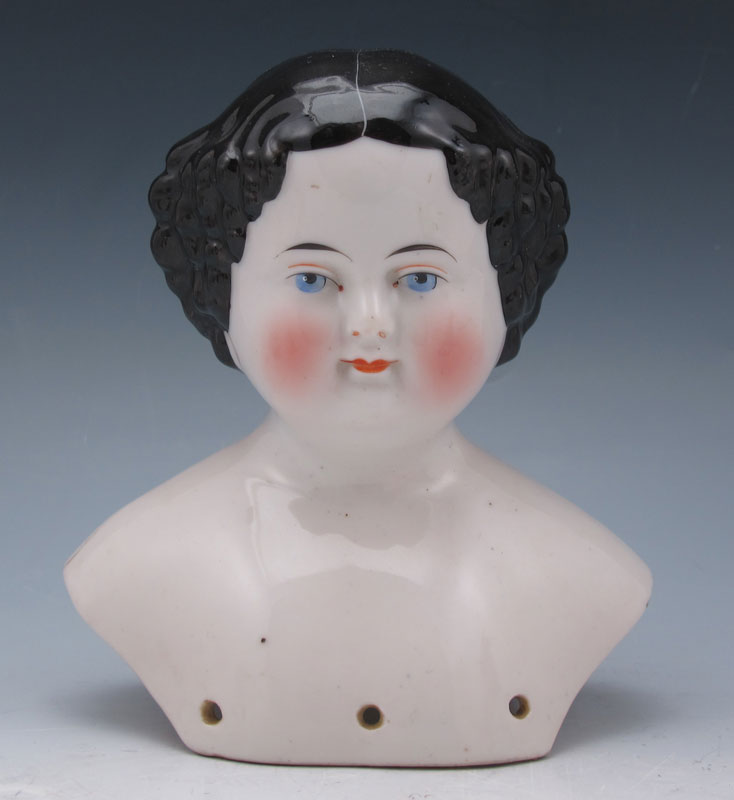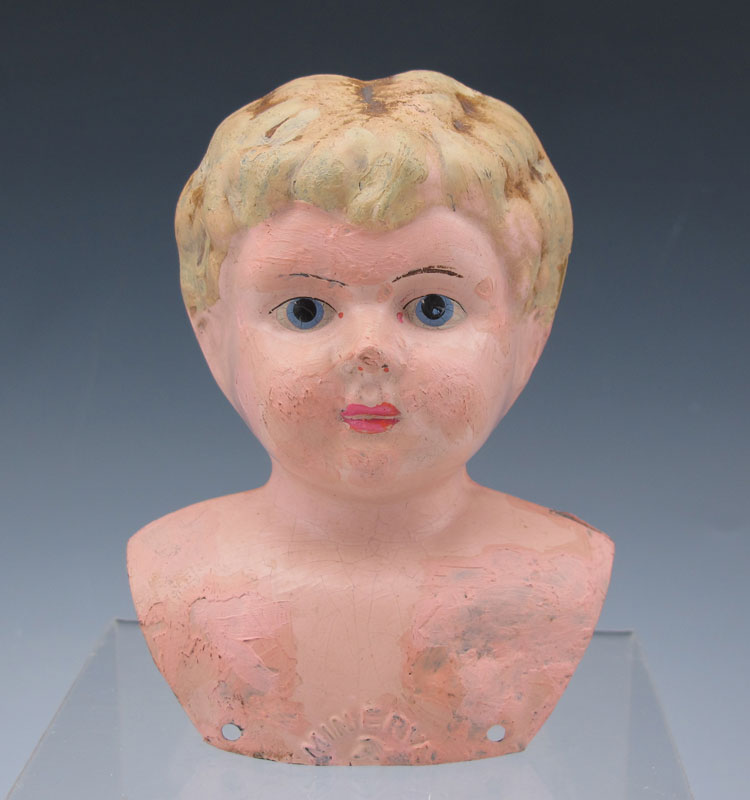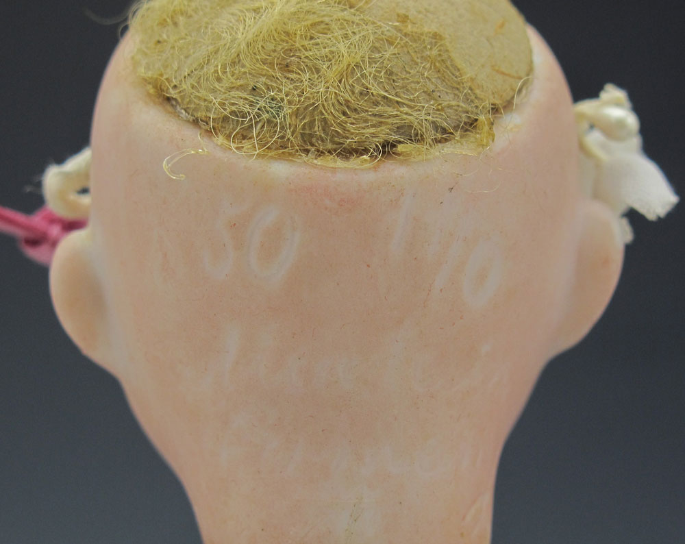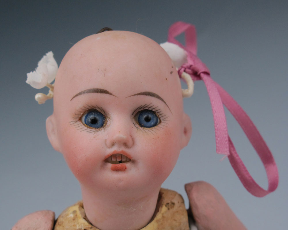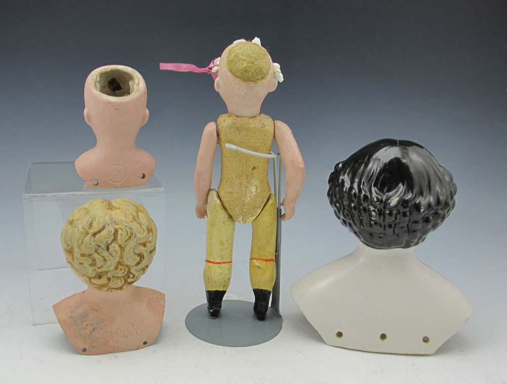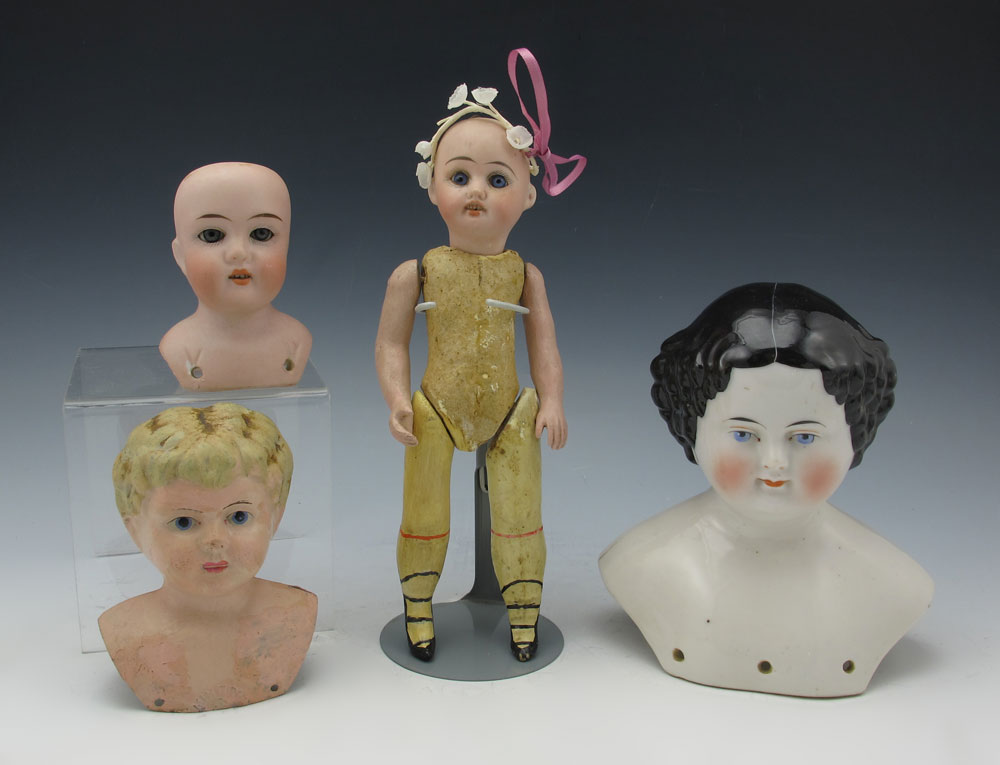 GERMAN BISQUE HEAD DOLL PLUS EXTRAS: 8.5'' doll, bisque head marked 50 11/0, open blue glass eyes, open mouth with teeth. composition body. Sold together with 3 shoulder heads, German metal head with later paint, a molded hair porcelain head, and a bisque head with sleepy eyes.