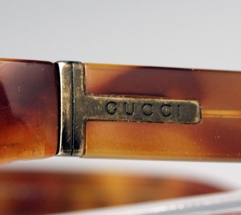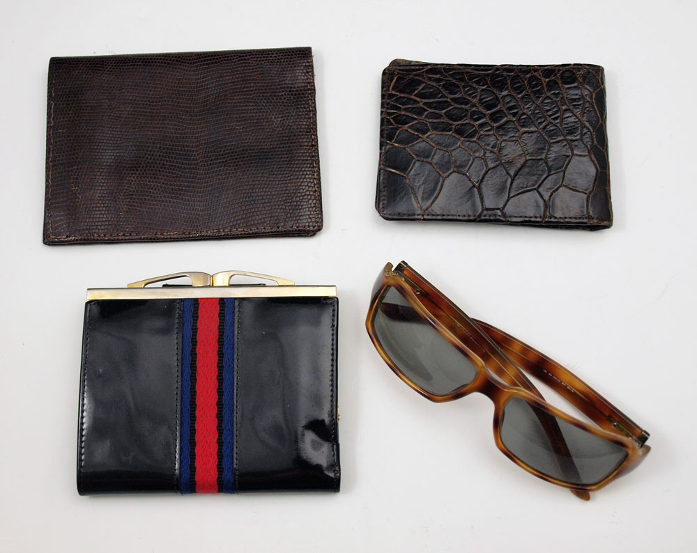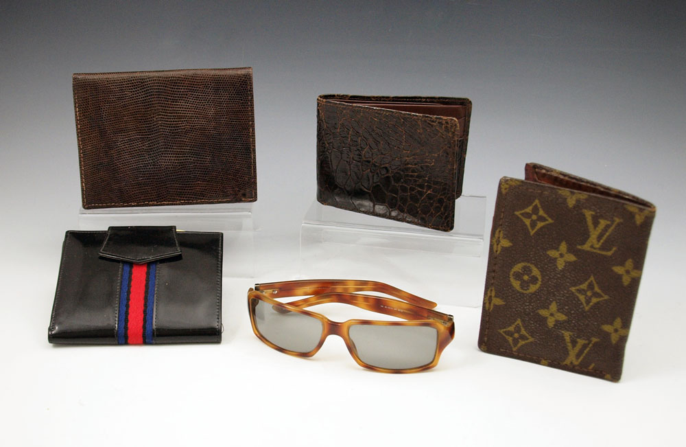 VINTAGE GUCCI SUNGLASSES & 4 WALLETS: To include 1) Gucci 130 faux tortoise shell frame sunglasses. 2) Louis Vuitton bi fold wallet with classic Vuitton design. 3) Unmarked alligator skin bifold wallet. 4) Unmarked bifold snake or lizard skin wallet. 5) Buchner leatherette change purse.