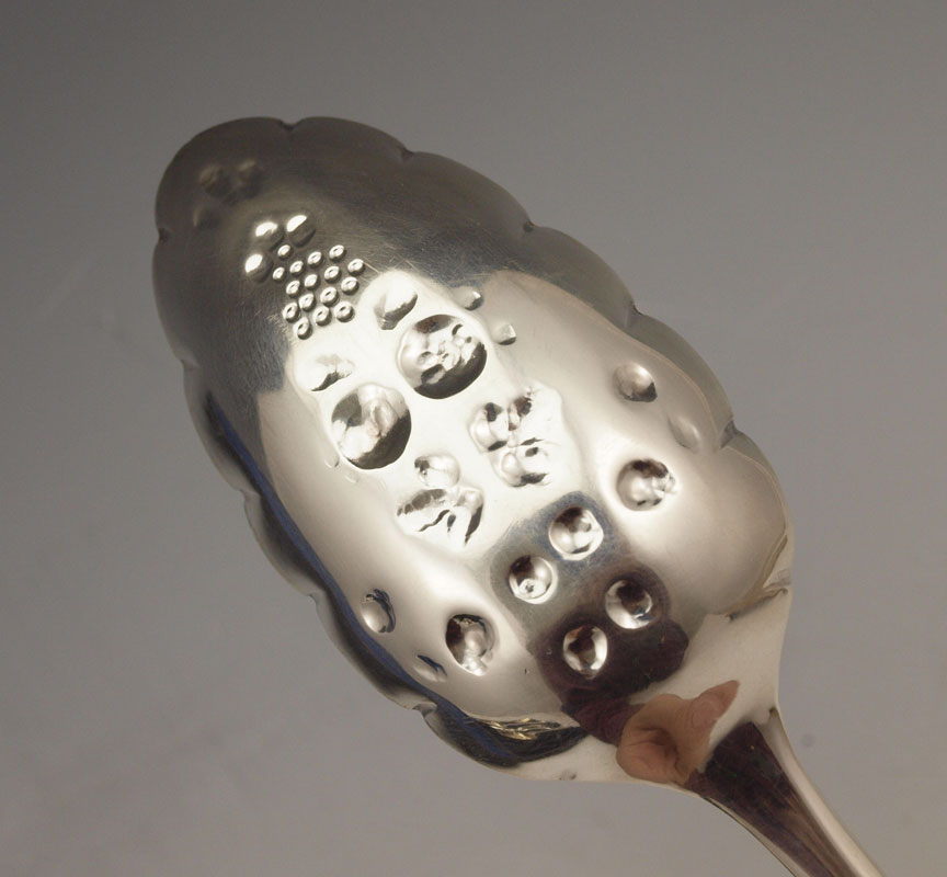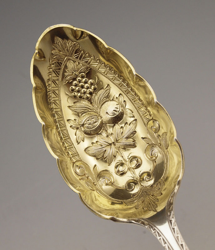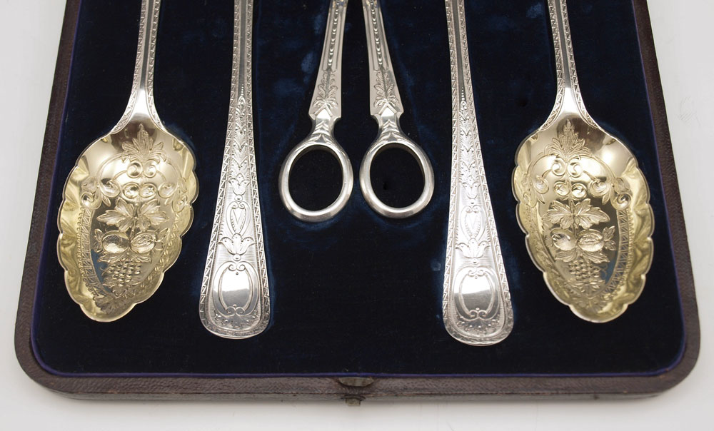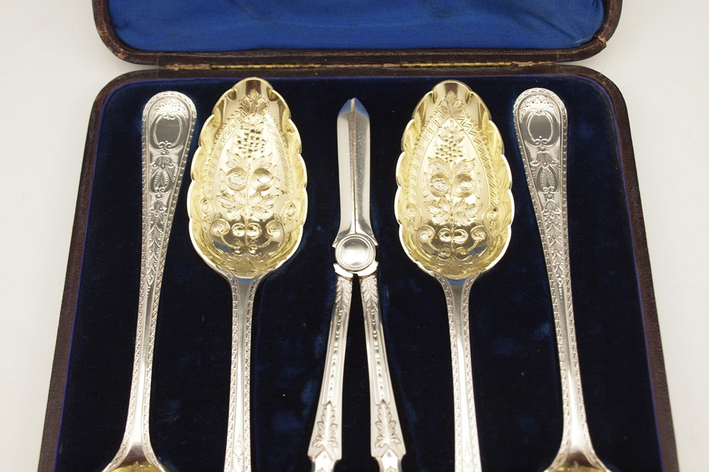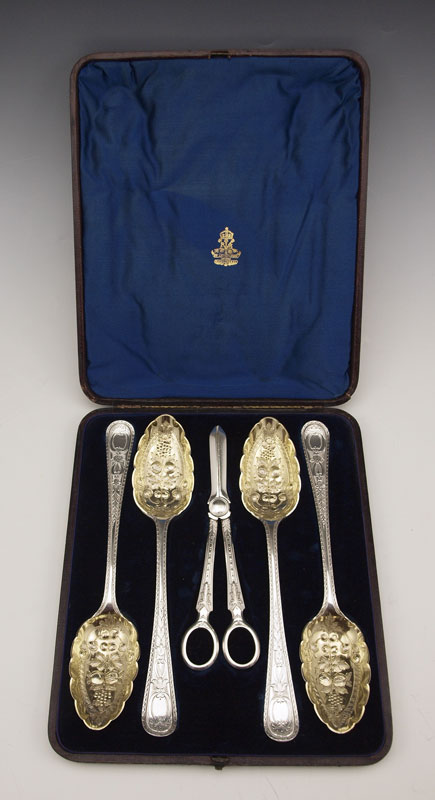 ELKINGTON SILVERPLATE BERRY SPOON SET: In presentation case, to include 4 spoons with vermeil bowls 8 3/4'', shears 7 7/8''. Sold with velvet & cloth lines presentation case with Elkington seal interior, 10'' x 8 1/2''.