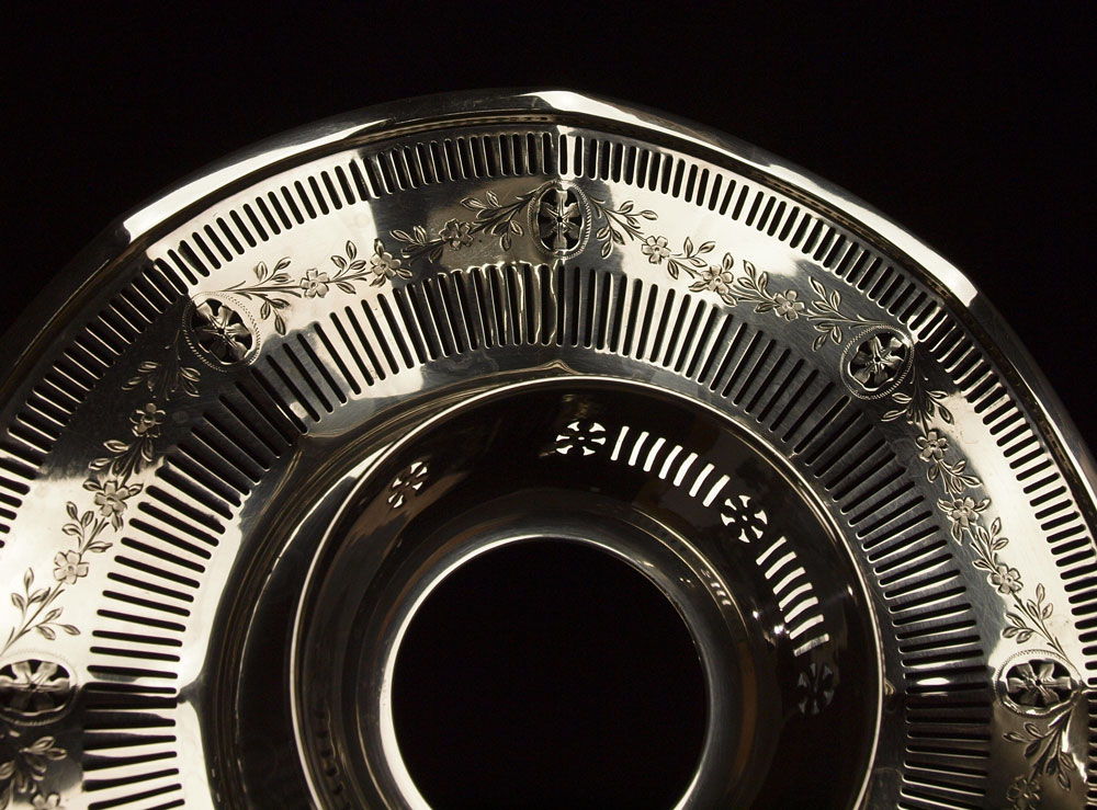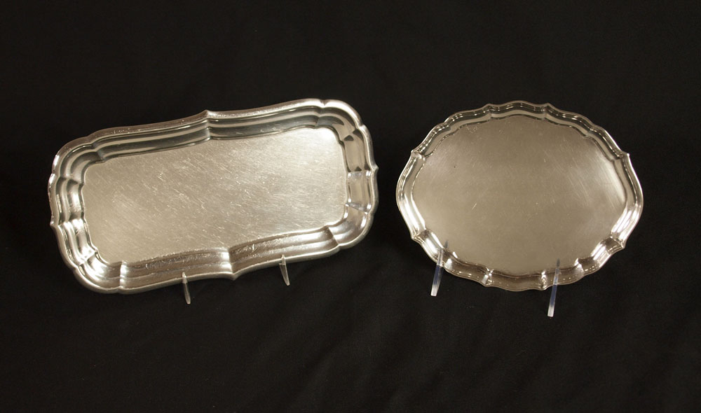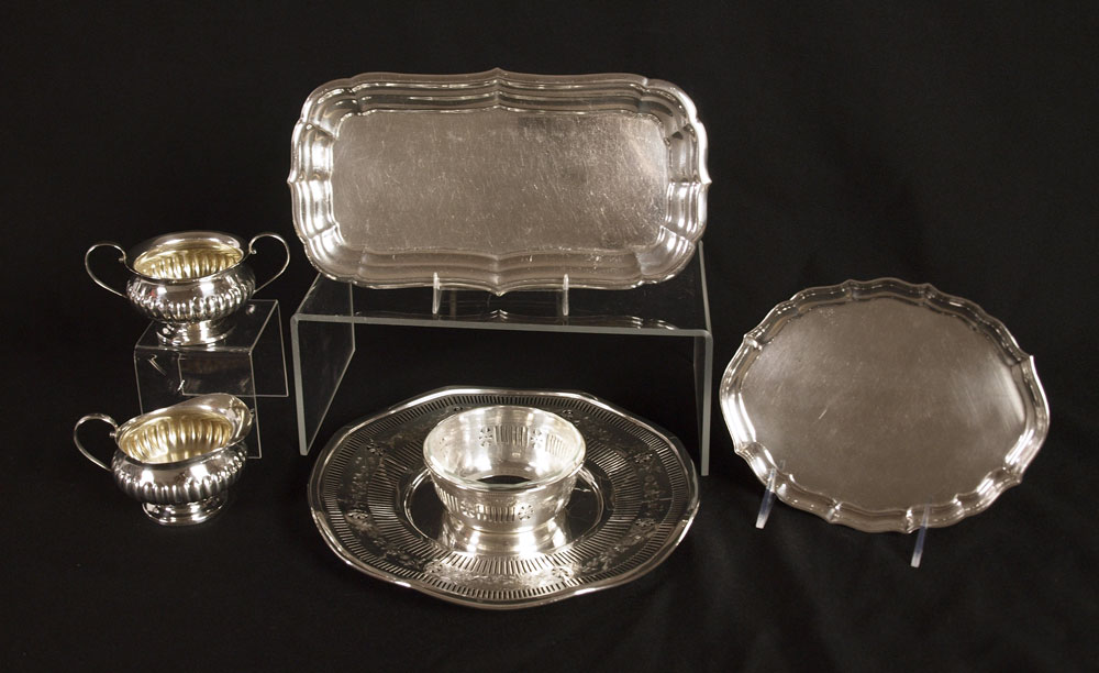 ESTATE COLLECTION OF STERLING TRAYS & MORE: To include 1) 1917 Gorham reticulated tray with attached sauce, replacement glass insert. 1 3/4'' h. x 9 1/2'' dia. 2) 1947 Gorham small tray in the Chippendale pattern, 7 5/8'' x 6''. 3) Reed & Barton small tray in the Windsor pattern, 10 1/2'' x 5 5/8''. 4) 1947 Reed & Barton open cream & sugar. 2 5/8'' x 5 1/8''. Approx. 28.9 troy oz.