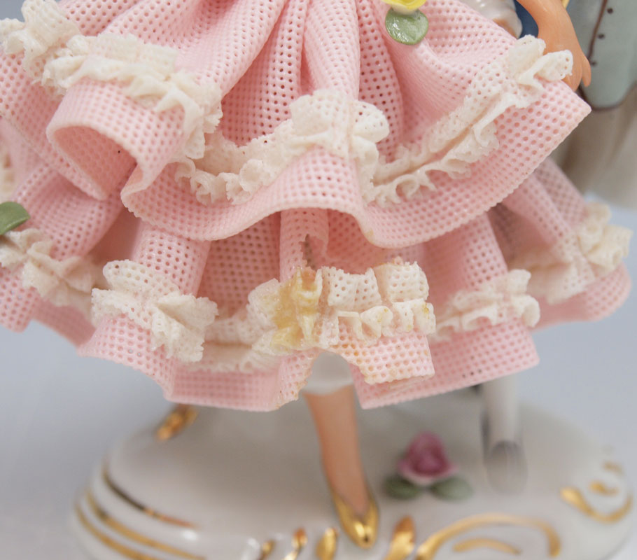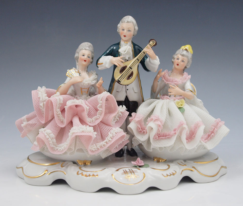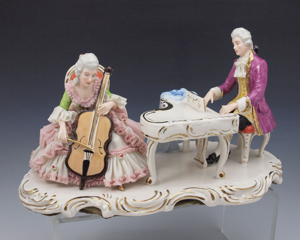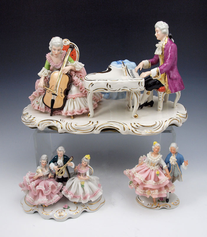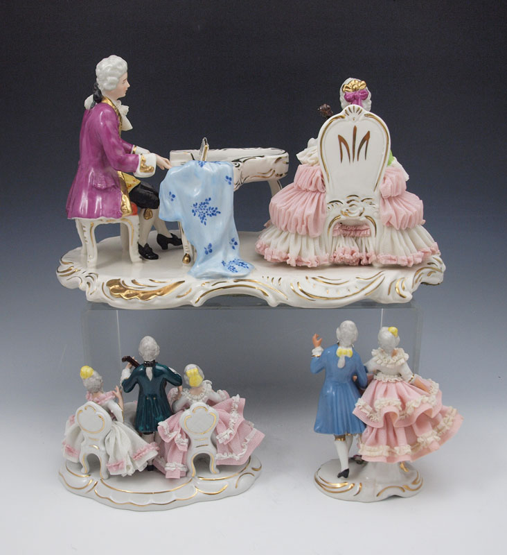 3 LACY DRESDEN MUSICIAN THEME FIGURAL GROUPS: Large Dresden Art figure with cellist and pianist, 7 1/2''h. x 13''. The two smaller figurines of couples measure 5''h, crown N Dresden mark. Please allow for lace damage.