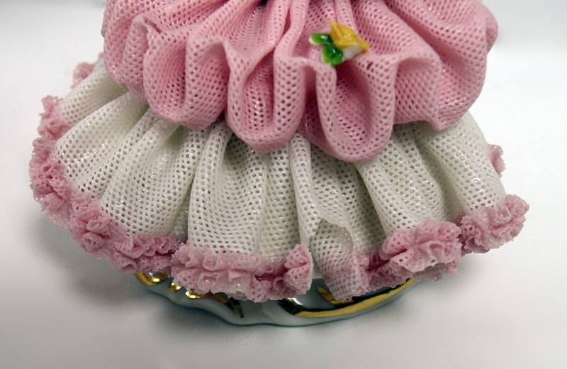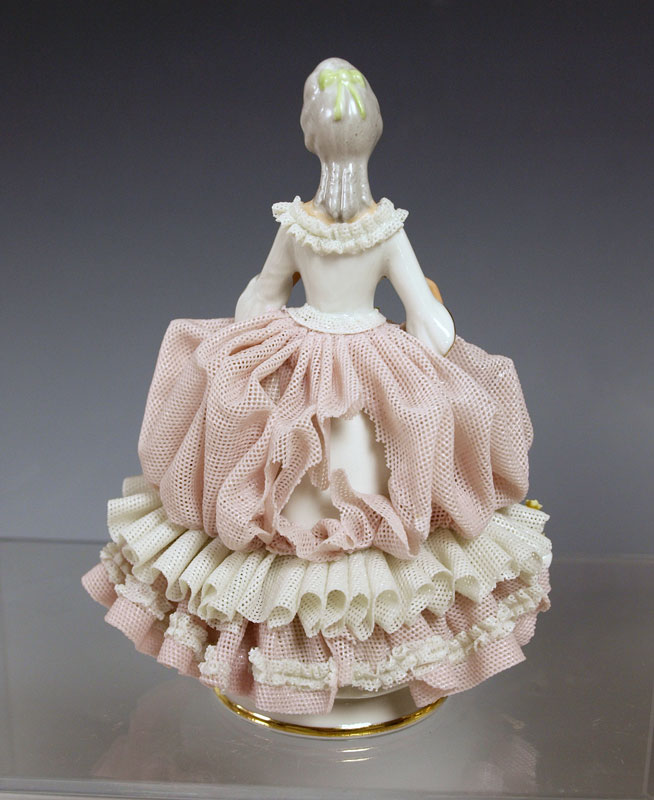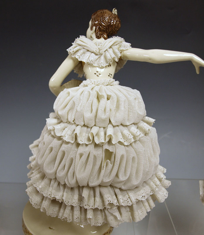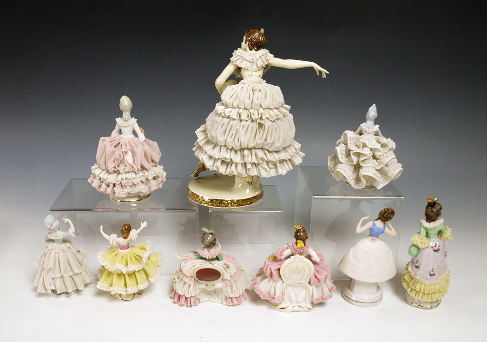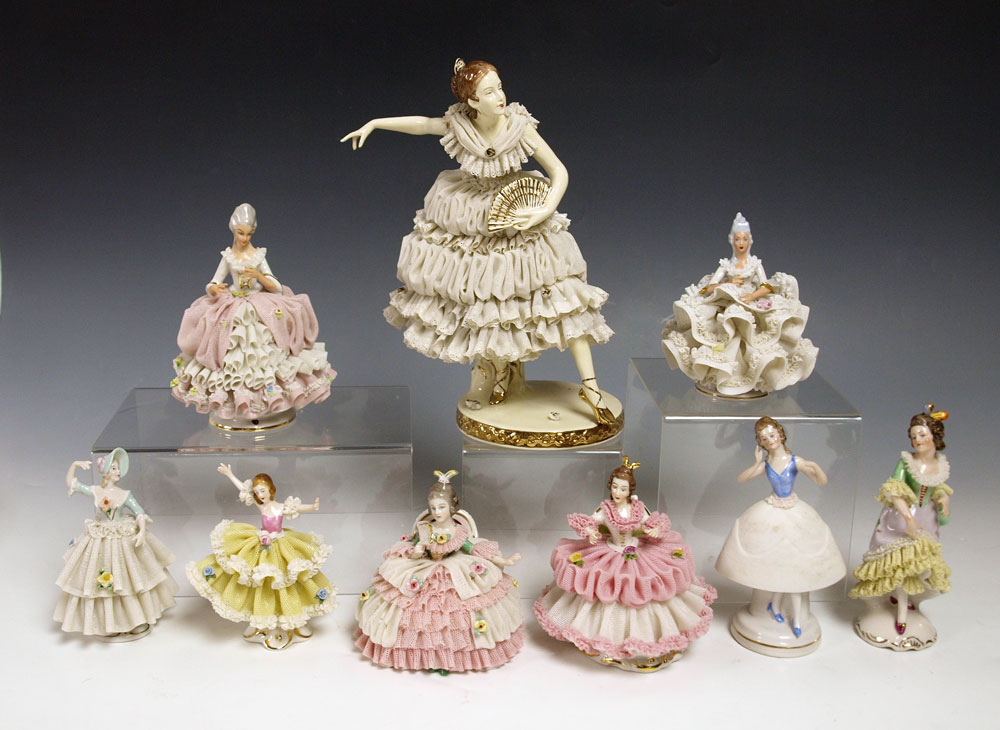 GROUP OF 9 DRESDEN LACY FIGURINES: The lady in white, 9 1/2''h., along with 8 miniatures, 4-6''. Please allow for lace damage.
