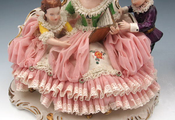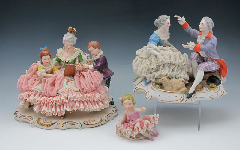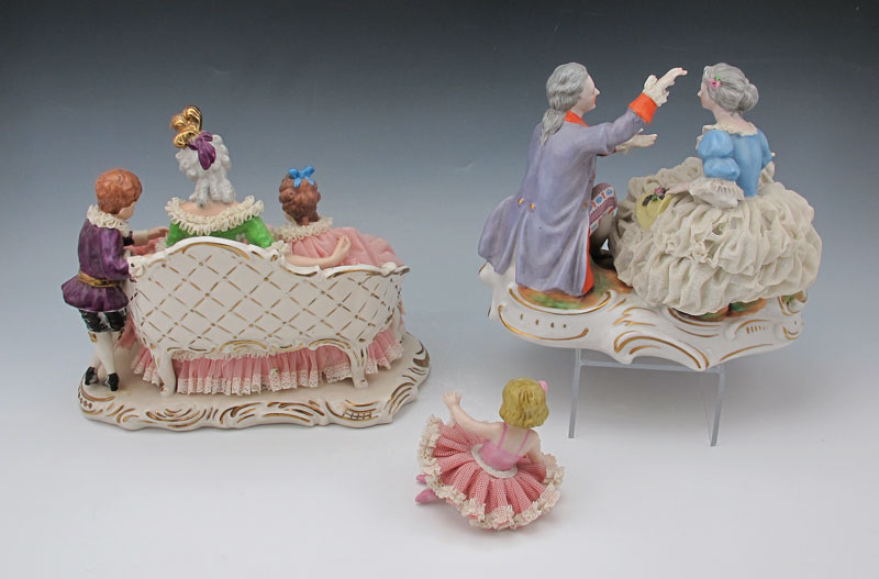 3 DRESDEN LACY FIGURINES: 1) Large group of woman with children, 7 1/2'' x 9''. 2) Ballerina child, 3''. 3) Lacy figure, 6'' x 8''.