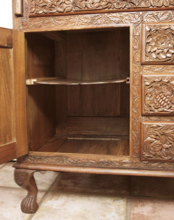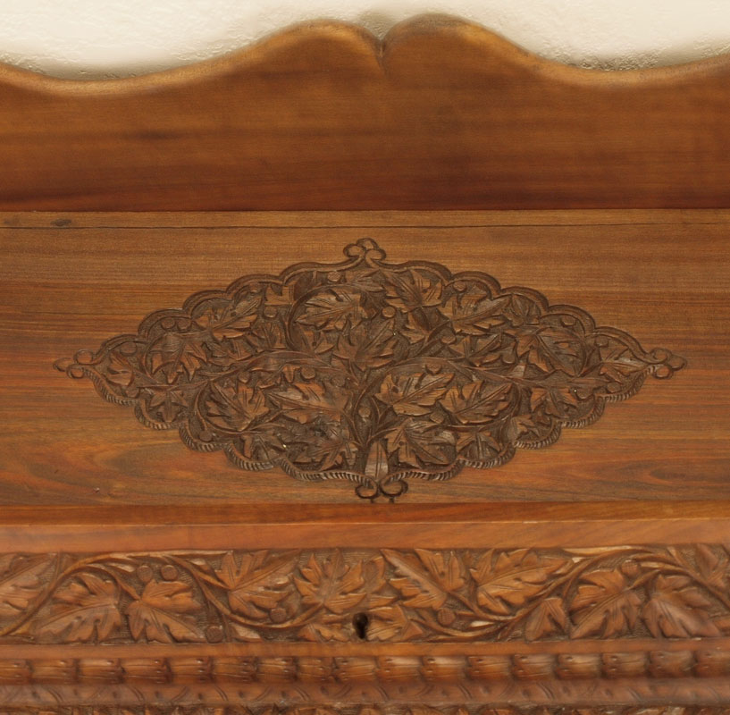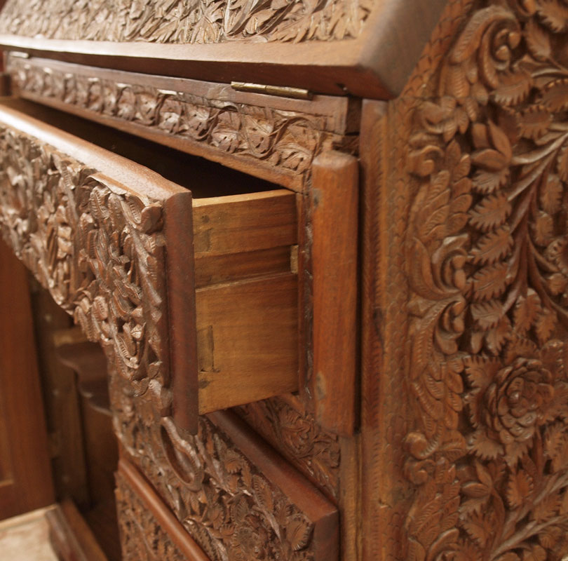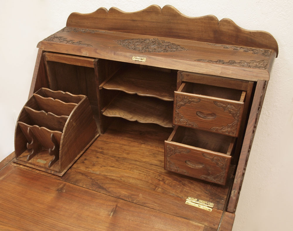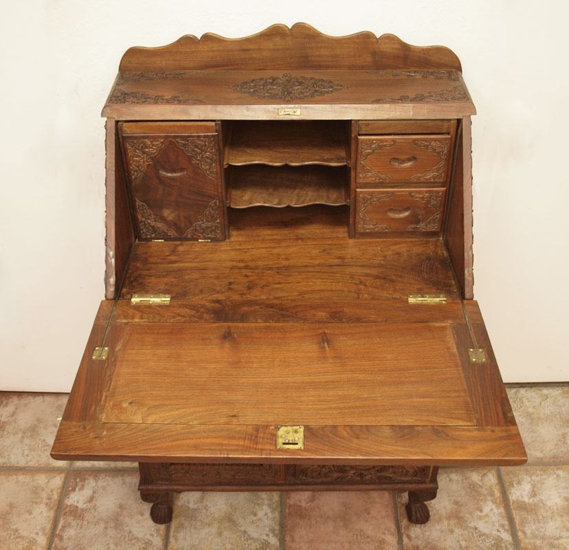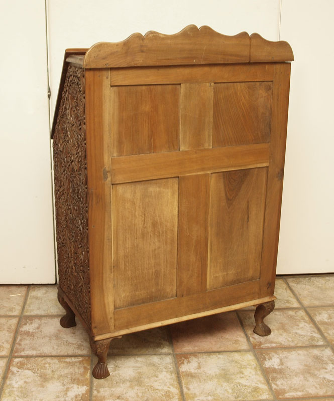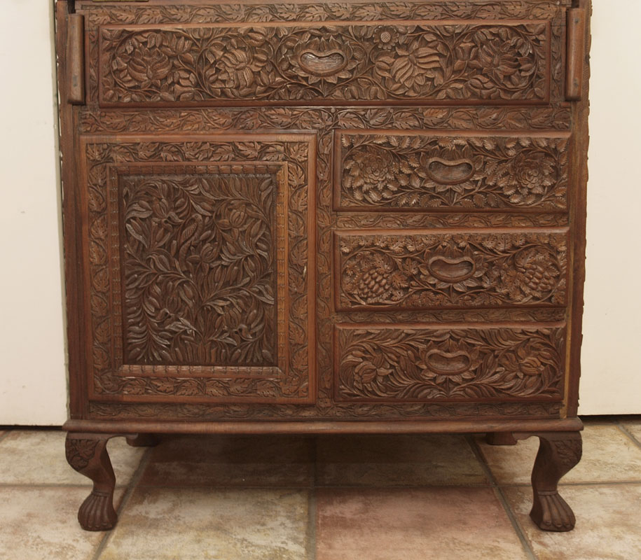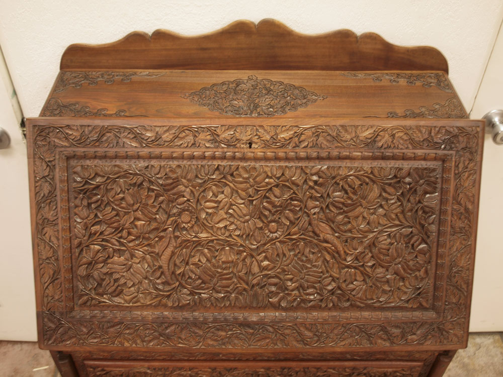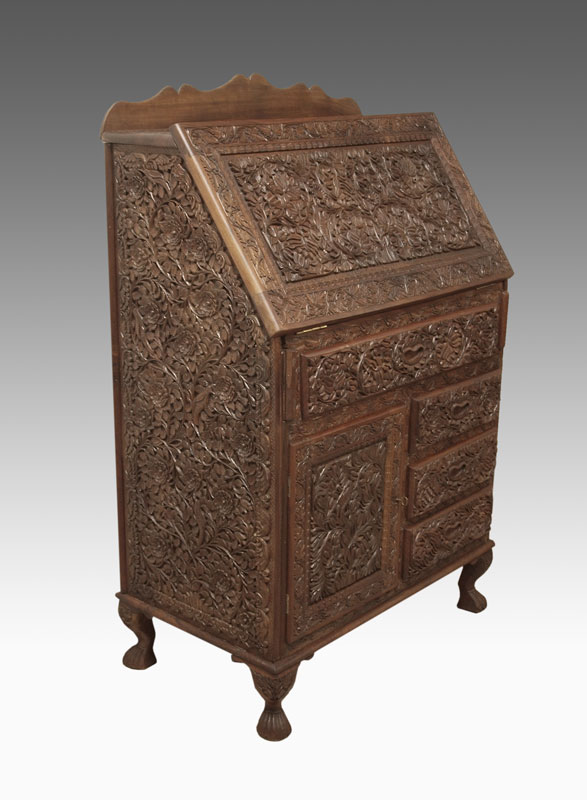 PROFUSELY CARVED SLANT FRONT DESK: Kashmir India brass nameplate, fitted interior, approx.45 x 30 x 17. Est. $400/600**