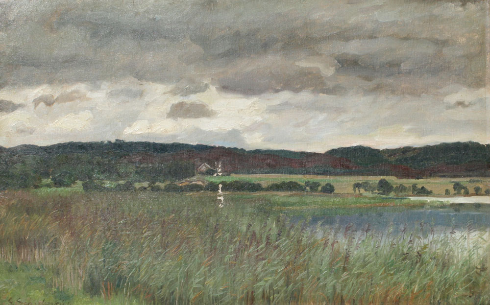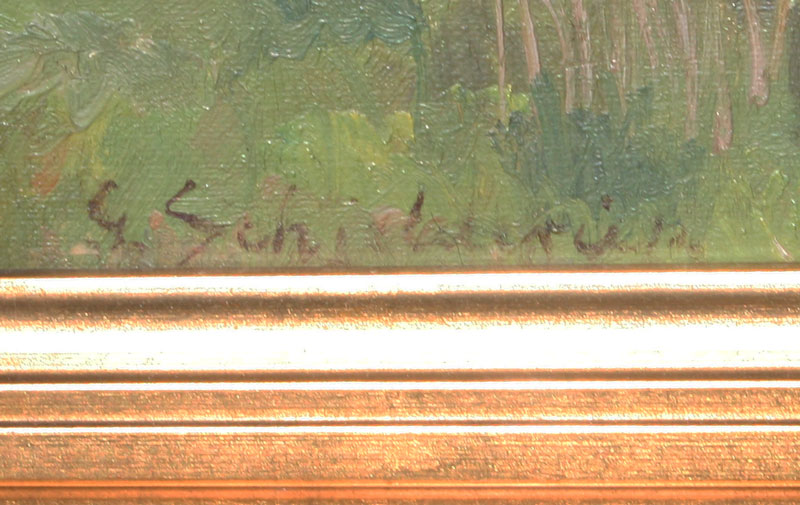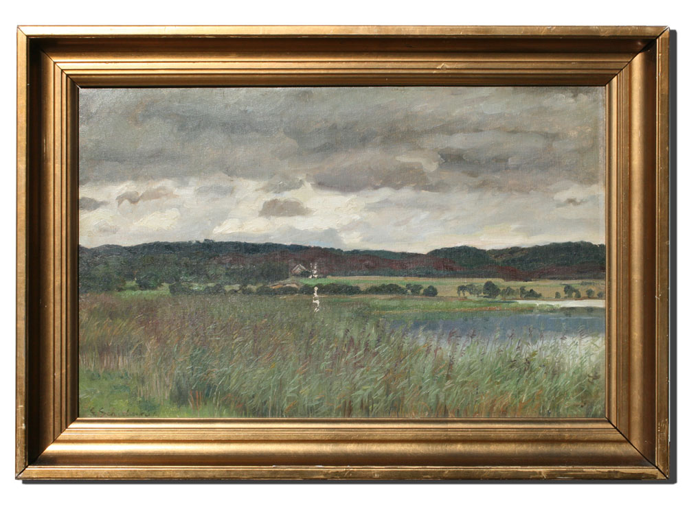SCHJELDERUP, Leis, (Danish, 1856-1933): Country landscape with pond and farmhouse, O/C, 14 3/4'' x 23 1/2'', signed lower left, encased in original gilt frame, 19'' x 28'' with some wear and missing gilt. Est. $300/500**