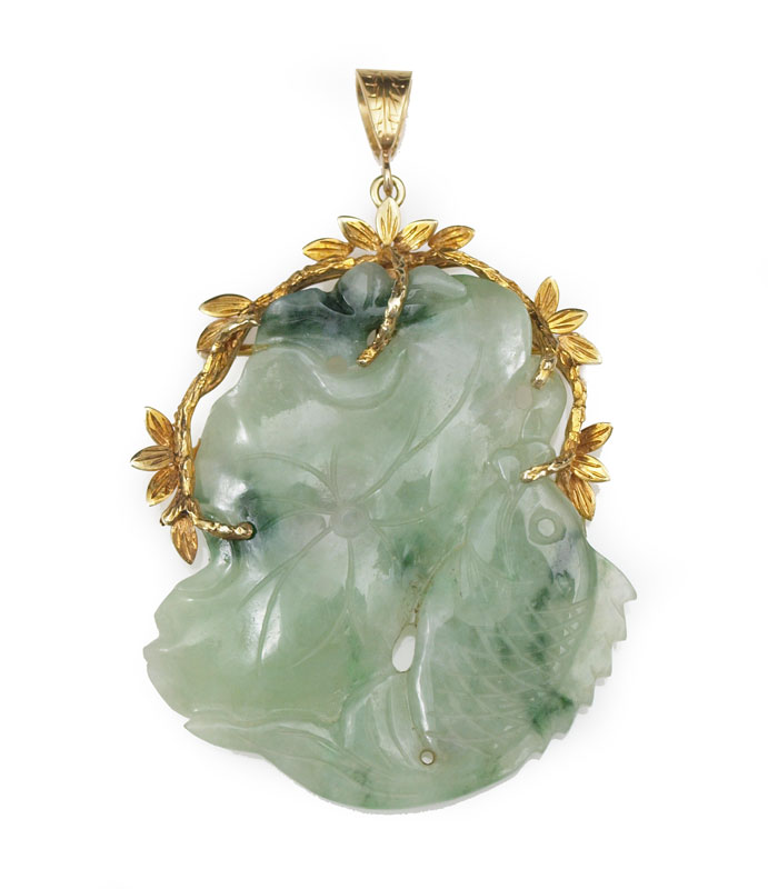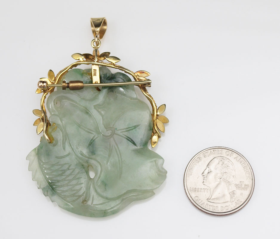 18K JADE PENDANT/BROOCH: 18K yellow gold branch motif frame with jade cut in a fish and lily pad design. Approx. weight: 10.0 grams. The jade measures approx. 2'' x 1 3/4''.