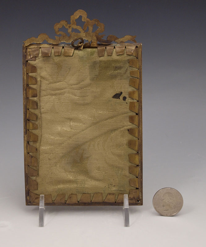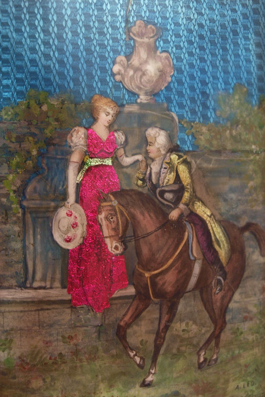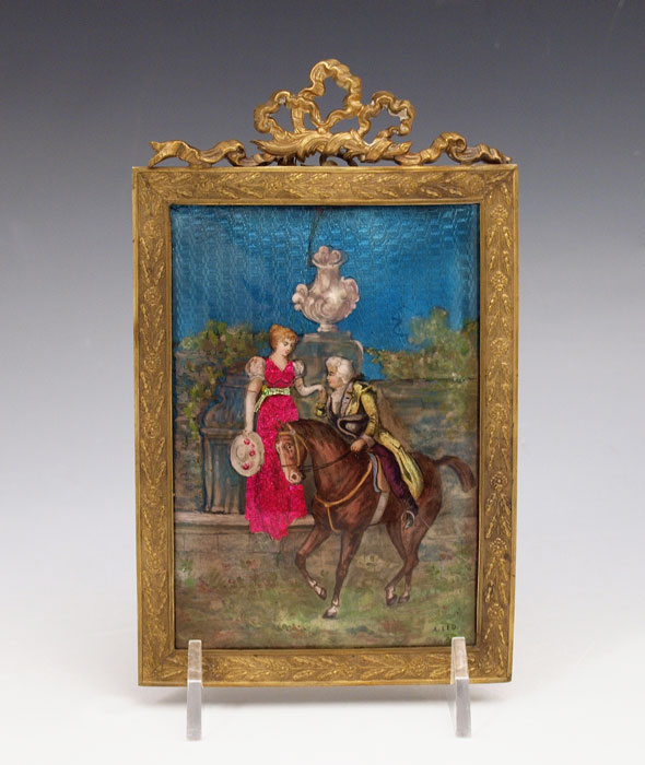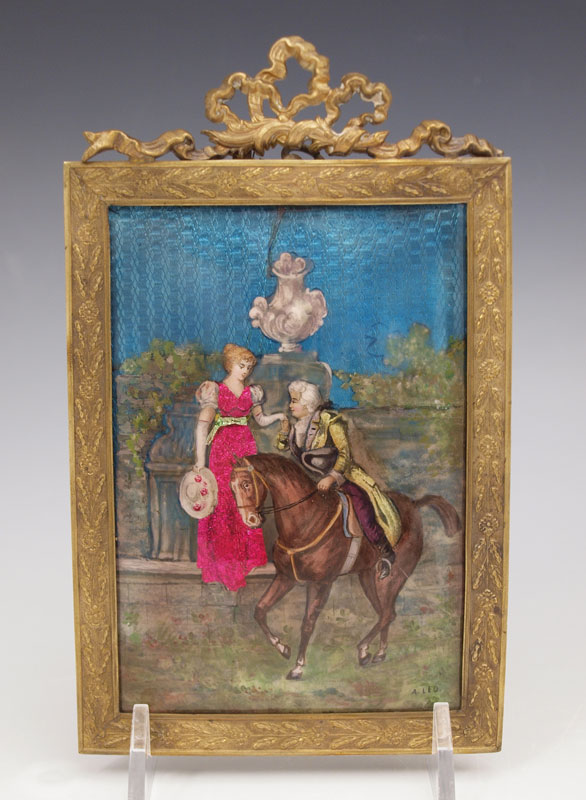 ENAMEL MINIATURE: Artist signed A. Leo. Miniature enameled image of a horse, an enamored rider and young lady, encased in period gilded metal frame, image measures 4 1/4'' x 3''.