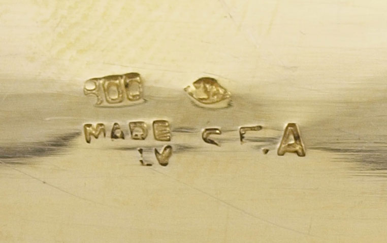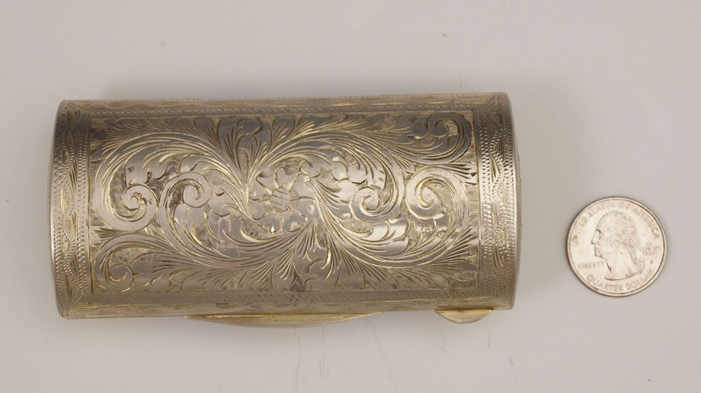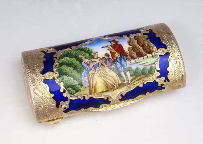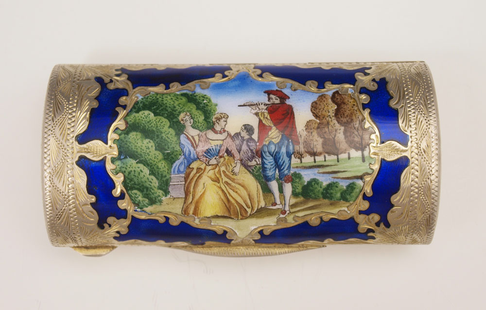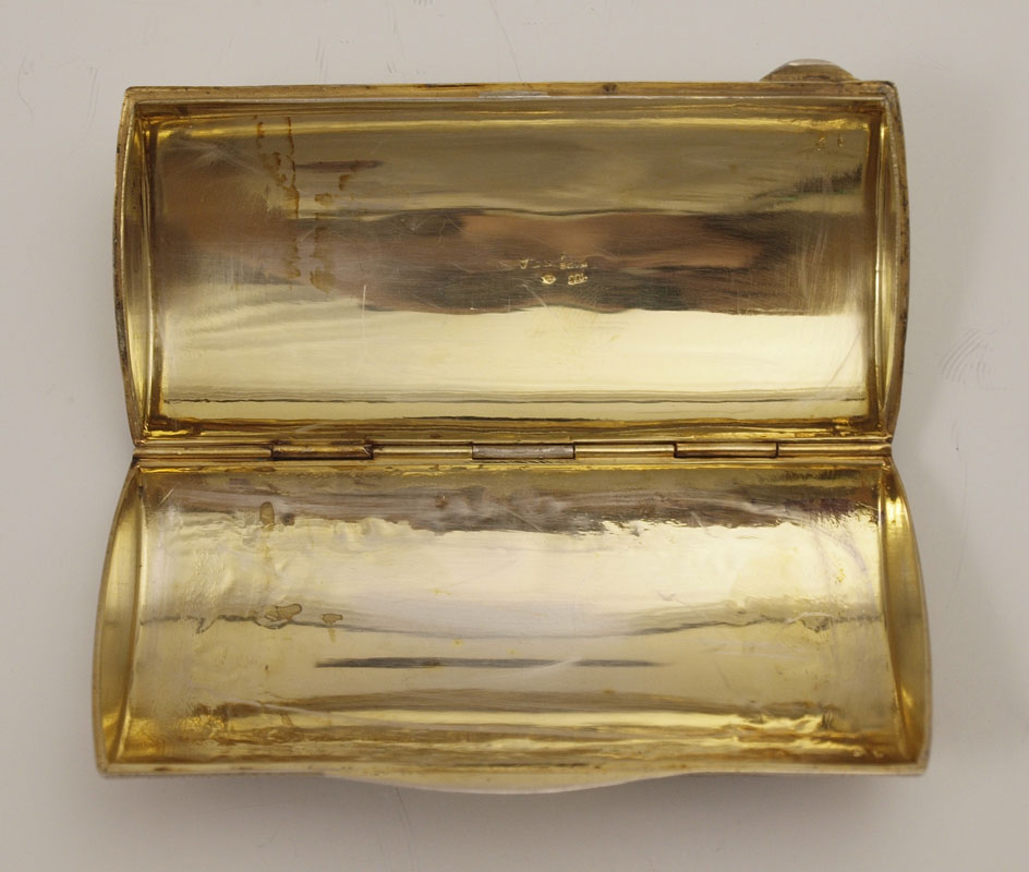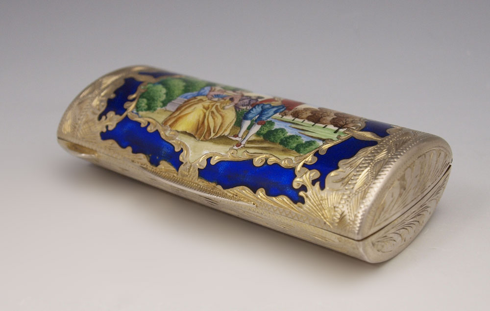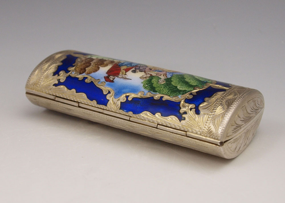CONTINENTAL ENAMELED SILVER BOX: Embossed silver hinged box, vermeil interior. Enameled scene. Marked 800 and Made, along with illegible marks. 1 1/8''h. x 4 1/4'' l.