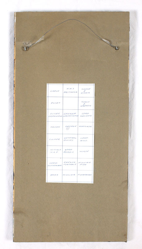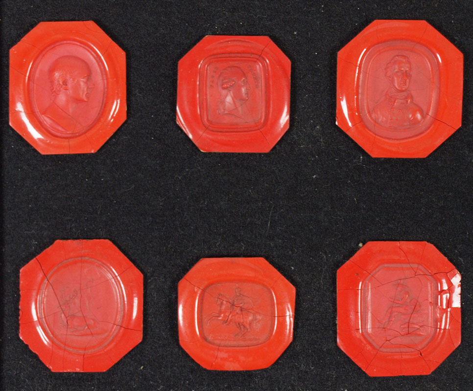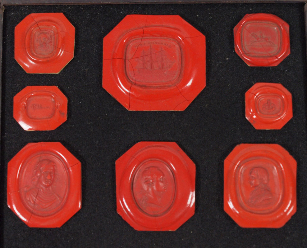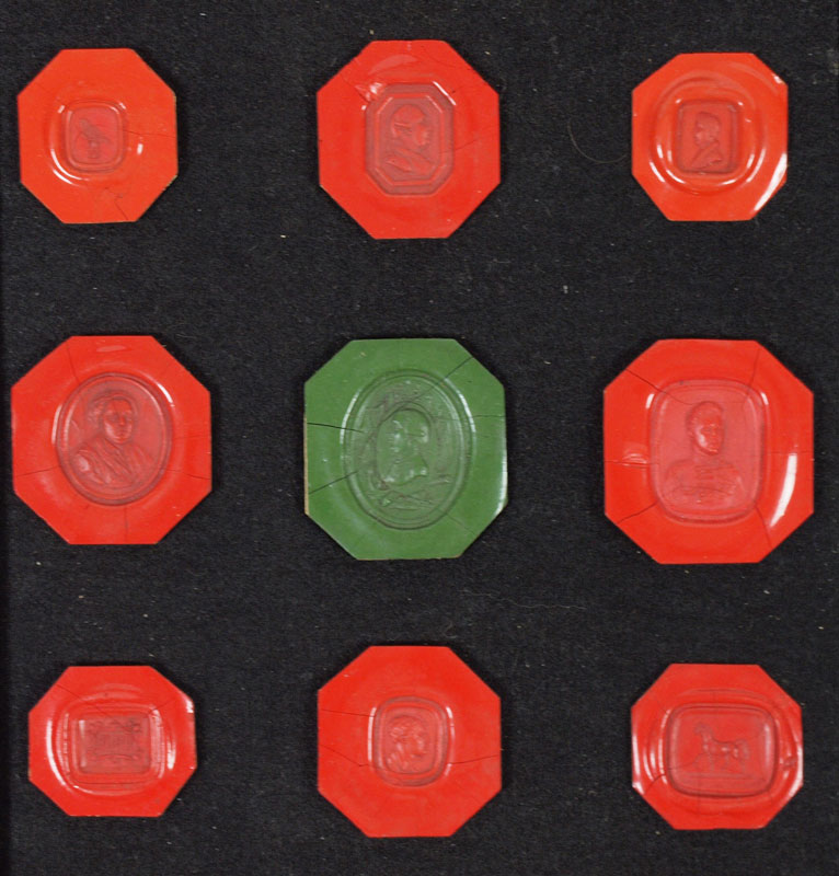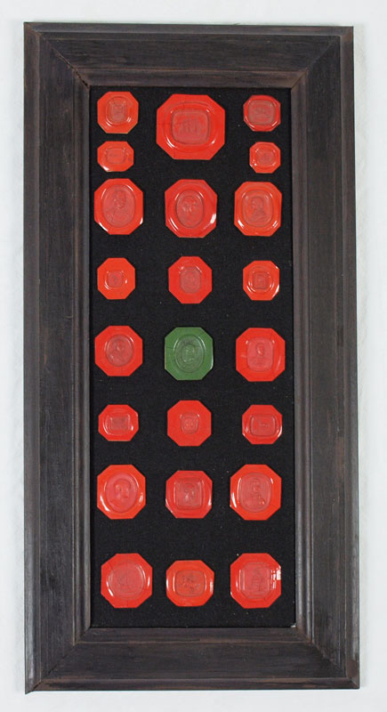 COLLECTION OF 23 WAX SEALS: Collection consists of notable English historical figures, HMS Brittania, horses and others. seals have been affixed to cardboard, cardboard pieces affixed to felt lined board. Largest seal measures 1 7/8'' x 2'', frame, 19 3/4'' x 9 3/4''.