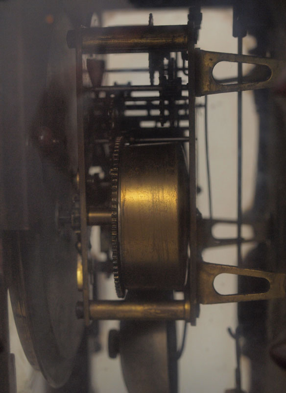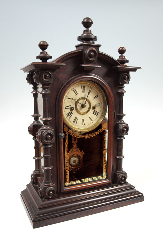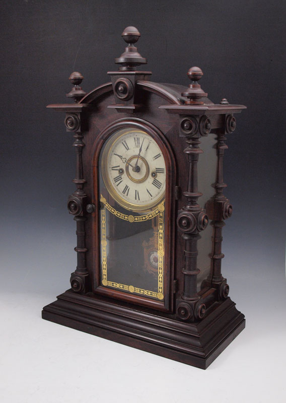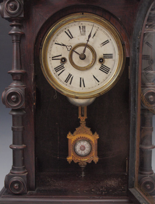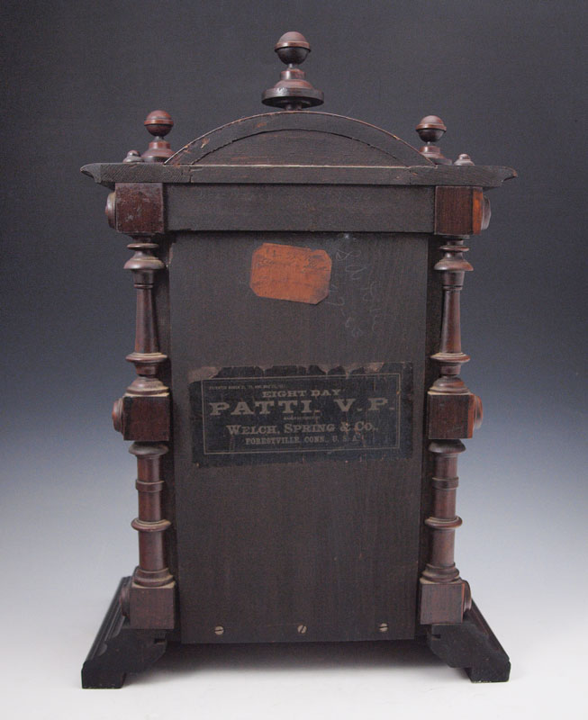 WELCH, SPRING & CO. ROSEWOOD 8 DAY PATTI CLOCK: 8 day Patti time and strike movement. Carved and shaped 3/4 column supports with glass on 3 sides, front glass reverse painted. Metal face, Ornate pendulum and Key in office. 19'' h x 12 1/2'' x 6 1/4''. Welch, Spring & Co. label on back.