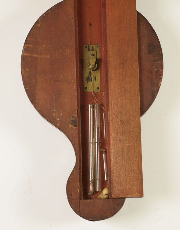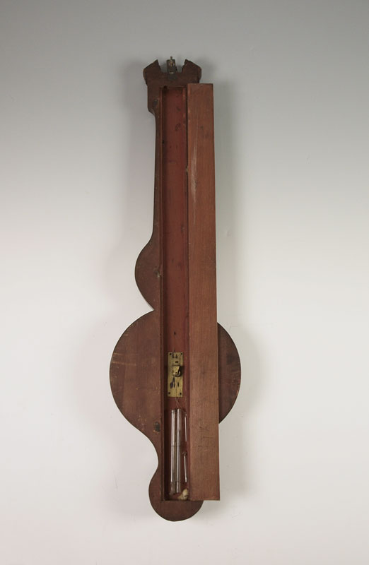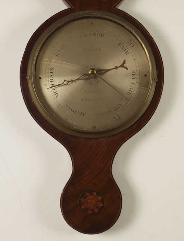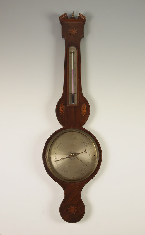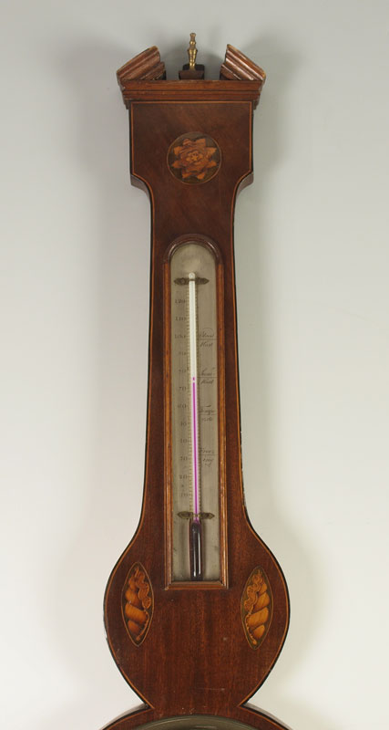 J. LETTEY ENGLISH INLAID BANJO BAROMETER: Inlaid case with rose & shell motifs, silvered dial and plate for thermometer. Dial marked J. Lettey, Dunster, Warrented. 38 3/4'' h. x 10 1/4''.