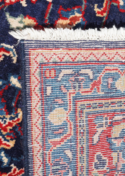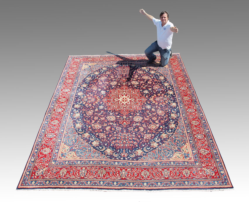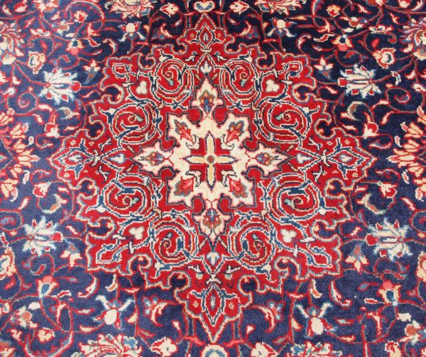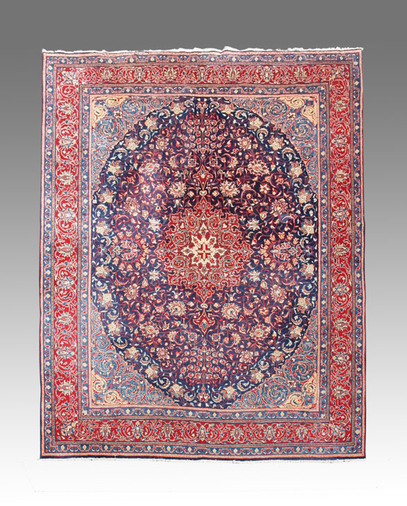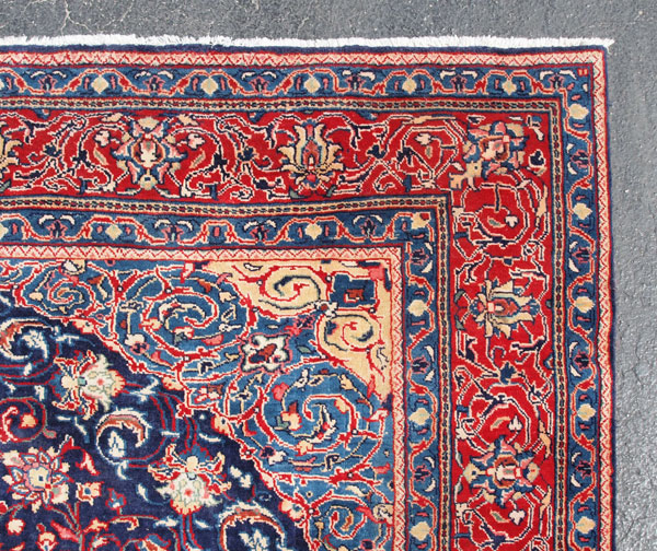 PERSIAN ISPHAHAN HAND KNOTTED WOOL CARPET: Approx. 8' 8'' x 12' 8'', modern blue field with curvilinear designs around a red round central medallion.