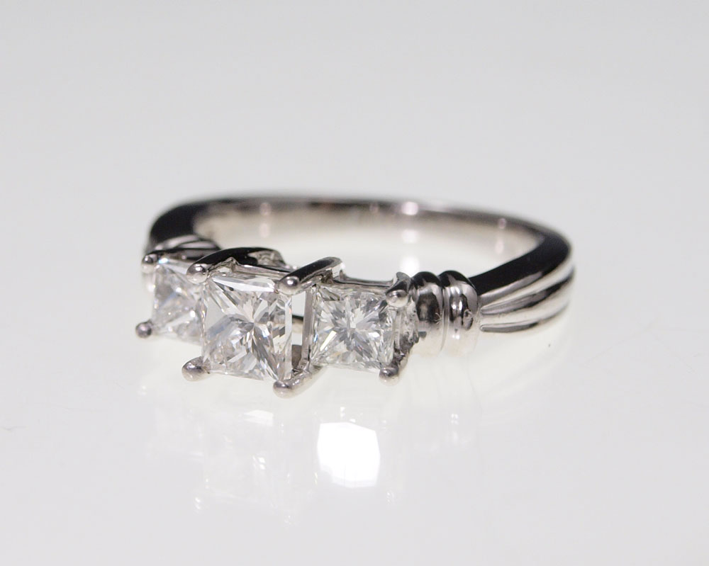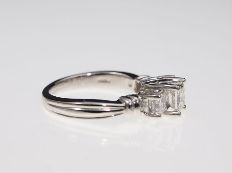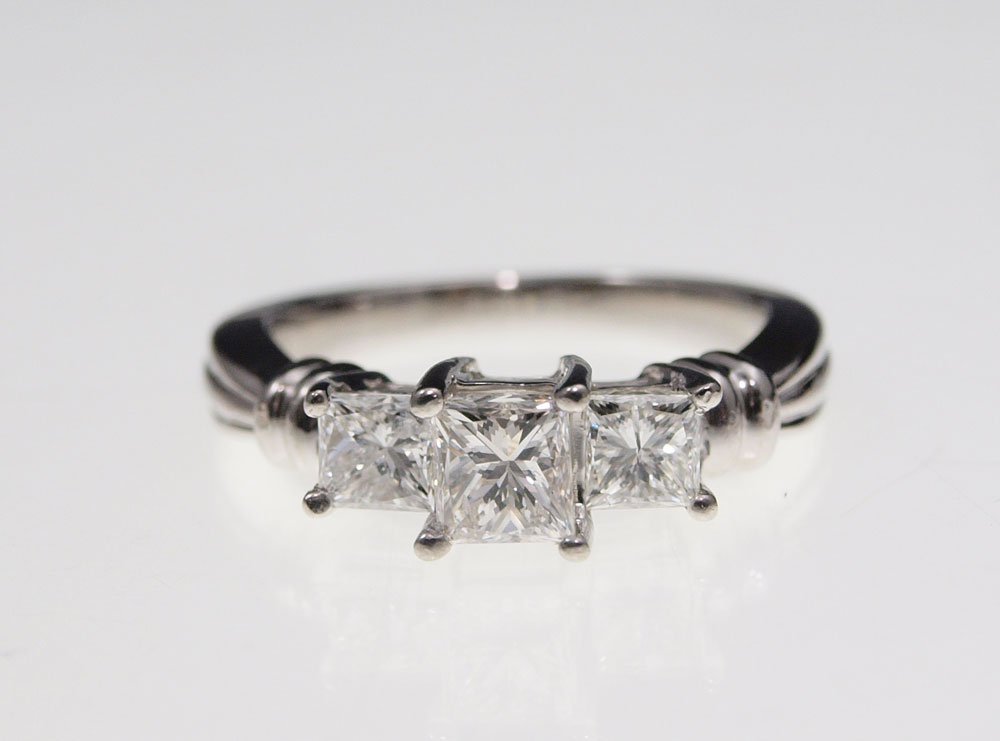 PLATINUM 3 STONE 1.5 CT DIAMOND RING: Platinum ring centers a square modified brilliant cut diamond, approx. 75Ct., rated Si1 clarity and I color. Flanked by 2 square modified brilliant diamonds, approx. .75 Ct, SI2 clarity and H-I color. The diamonds are prong set. Weight 8 grams. Sold with current Florida Diamond Appraisers GIA graduates appraisal for $7,250. Est. $2000/3500**