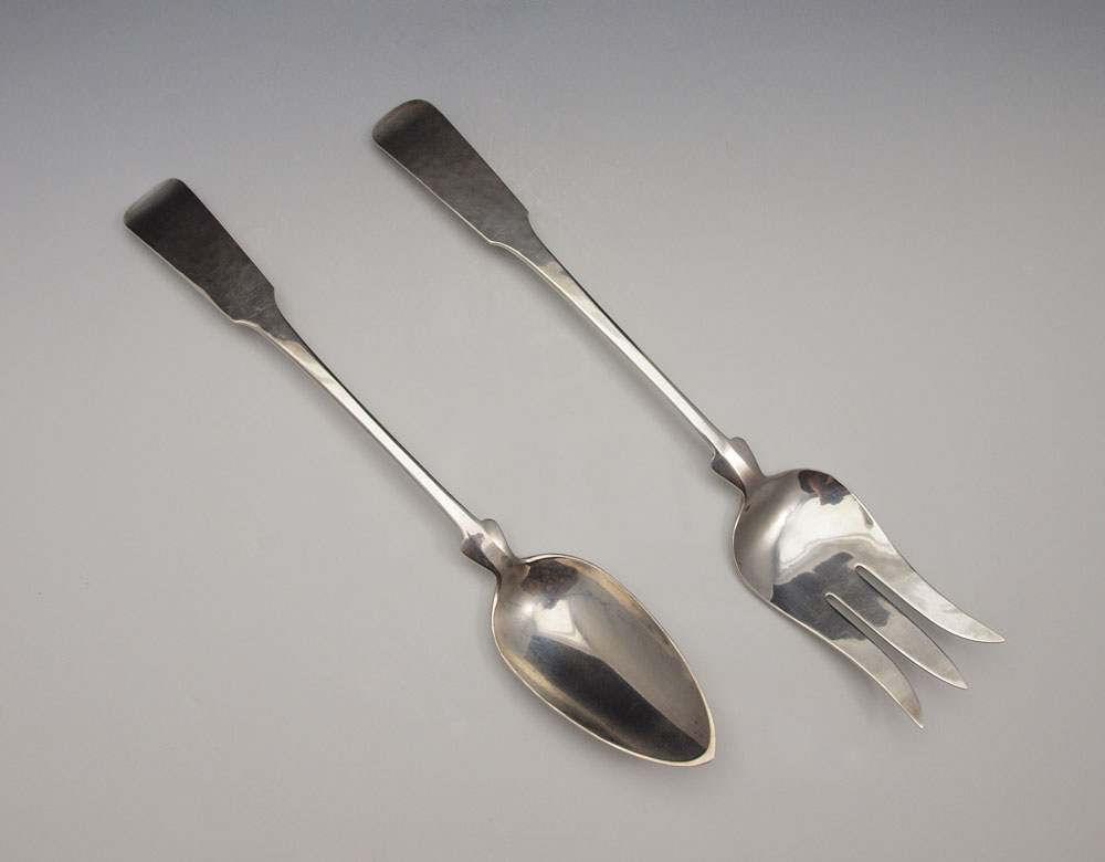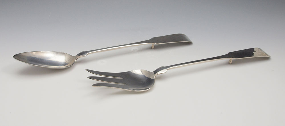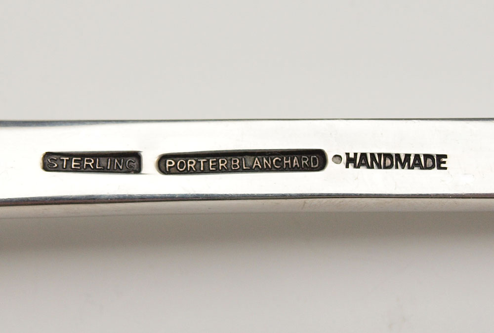 PORTER BLANCHARD STERLING SERVING FORK & SPOON: Marked Porter Blanchard Sterling Handmade to include 1) Large serving fork with attached rest, 13'' l. . 2) Large serving spoon with attached rest, 12 1/2''. Approx. 9.3 troy oz. Est. $250/350**