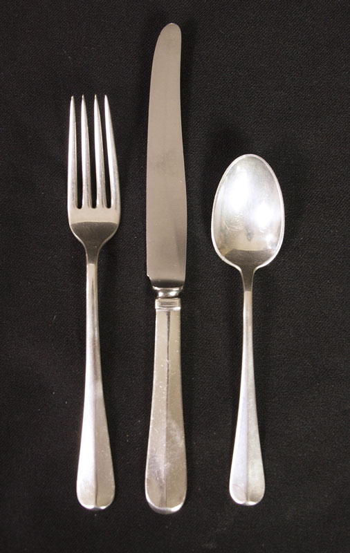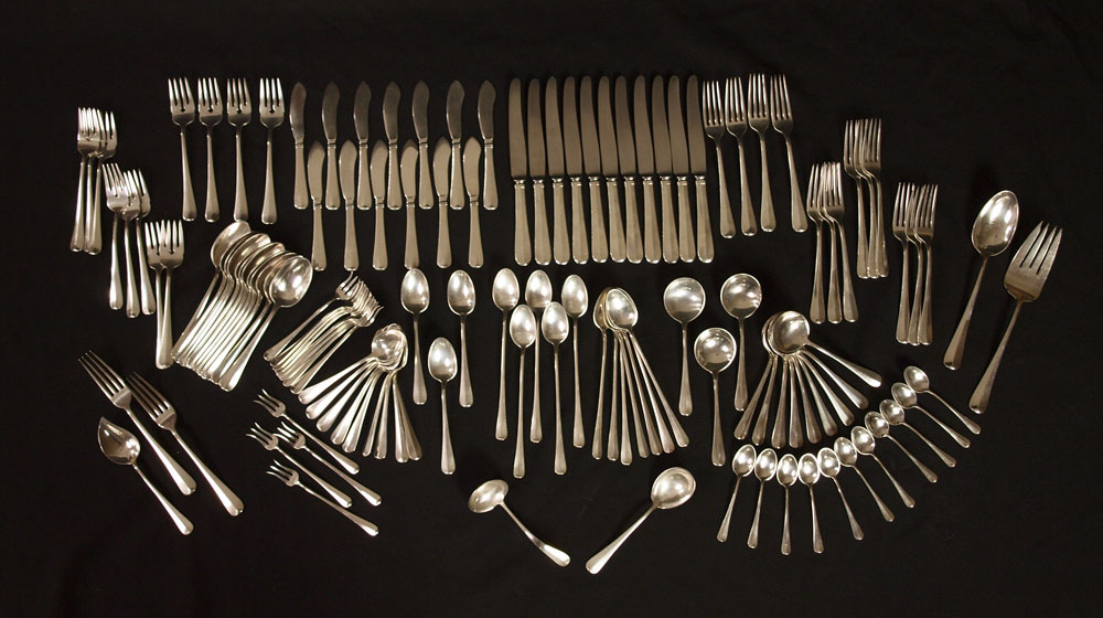 DOMINICK & HAFF STERLING FLATWARE COLLECTION: Approx. 127 pieces in the Rattail Antique pattern to include 13 forks (7''), 2 forks (7 3/4''), 12 salad forks (6 1/2''), 12 tablespoons (6 7/8''), 12 teaspoons (5 7/8''), 12 soup spoons (5 7/8''), 12 5 o'clock teaspoons (7 1/2''), 11 hollow knives (8 1/2''), 13 solid butter knives (6''), 12 cocktail forks (5 1/2''), 11 demitasse spoons (4 1/4''), serving spoon (8 1/8''), serving fork (8 7/8''), cream ladle (5''), sugar scoop (6''), jelly server (6 3/8''). Approx. 154.8 troy oz. Est. $4000/5000**